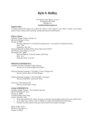 Kyle S. Holley is a student at Columbia College Chicago pursuing a bachelor's degree in journalism. He has experience in writing, editing, public speaking and strategic planning from internships at the U.S. Department of Transportation and the Columbia Chronicle newspaper. Holley also founded his own media production company and works as a recording artist. He is proficient in Microsoft Office and skilled in photography.