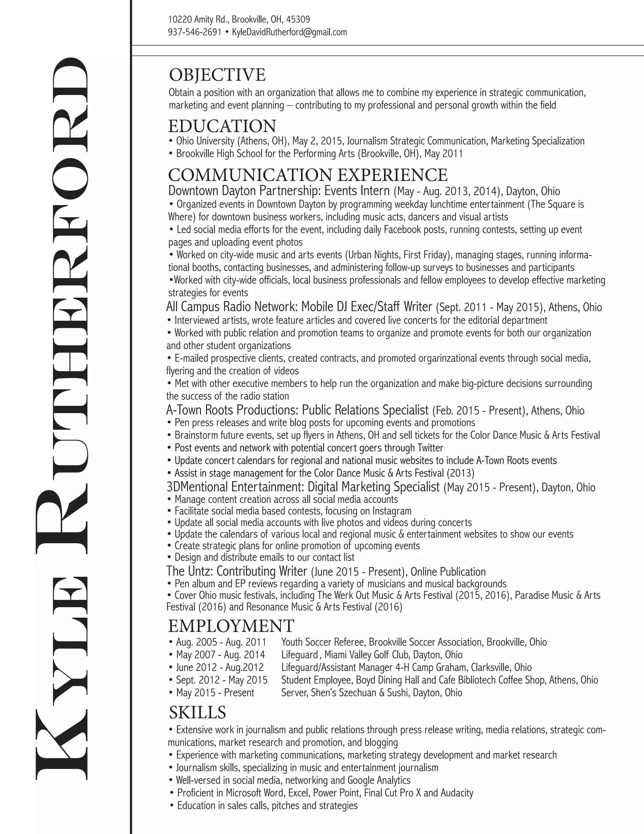 The document is a resume for Kyle Rutherford seeking a position combining experience in strategic communication, marketing, and event planning. It summarizes his relevant work experience, including roles organizing events and promotions for various music and arts organizations in Ohio, as well as writing about music festivals and artists. His skills include social media marketing, public relations, journalism, and digital marketing. He is proficient in Microsoft Office, video and audio editing software.