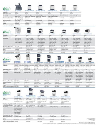 The document provides specifications for a range of color and black & white multifunctional and single-function printers from Kyocera, detailing their functions, print speeds, resolutions, maximum paper sizes, memory capacities, and standard paper capacities. Models include the CS and FS series, with various configurations for document processing and optional features. All specifications are subject to change and highlight the versatile capabilities of these products for various printing needs.