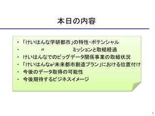 ミッションと取組経過 ・ けいはんなでのビッグデータ関係事業の取組状況 ・ 「けいはんなe2未来都市創造プラン」における位置付け ・ 今後のデータ取得の可能性 ・ 今後期待するビジネスイメージ 2