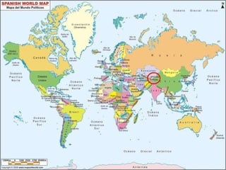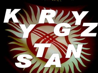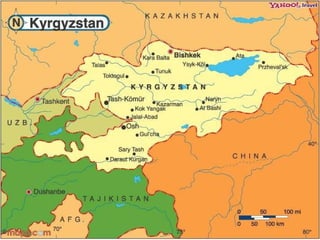 The document provides an overview of the geography, history, culture, and traditions of Kyrgyzstan. It notes that Kyrgyzstan has two mountain ranges that cover over 90% of the country. It also mentions several of Kyrgyzstan's peaks and lakes. The summary then briefly outlines when Kyrgyzstan gained independence and details some elements of Kyrgyz culture like traditional clothes, musical instruments, dances, games, and the epic poem of Manas.