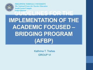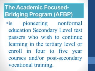 This document outlines guidelines for implementing the Academic Focused-Bridging Program (AFBP) in the Philippines. The AFBP aims to provide out-of-school youth and adults who passed the secondary level nonformal education tests access to tertiary education or vocational training. It focuses on building skills in science, math, English, history and test preparation. Implementation will be led by service providers who must meet criteria regarding their track record, management and financial capabilities. The Bureau of Nonformal Education will provide learning modules, technical assistance, and monitoring to ensure the success of the AFBP.