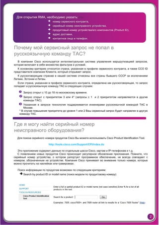 Документ содержит часто задаваемые вопросы о службе технической поддержки Cisco и процессе замены неисправного оборудования. Основные темы включают порядок открытия запроса на замену, критерию распределения сервисных запросов по командам, а также информацию об RMA и восстановлении оборудования. Также рассматривается, как клиенты могут отслеживать статус своих запросов и оборудования, а также процессе возврата неисправных устройств.