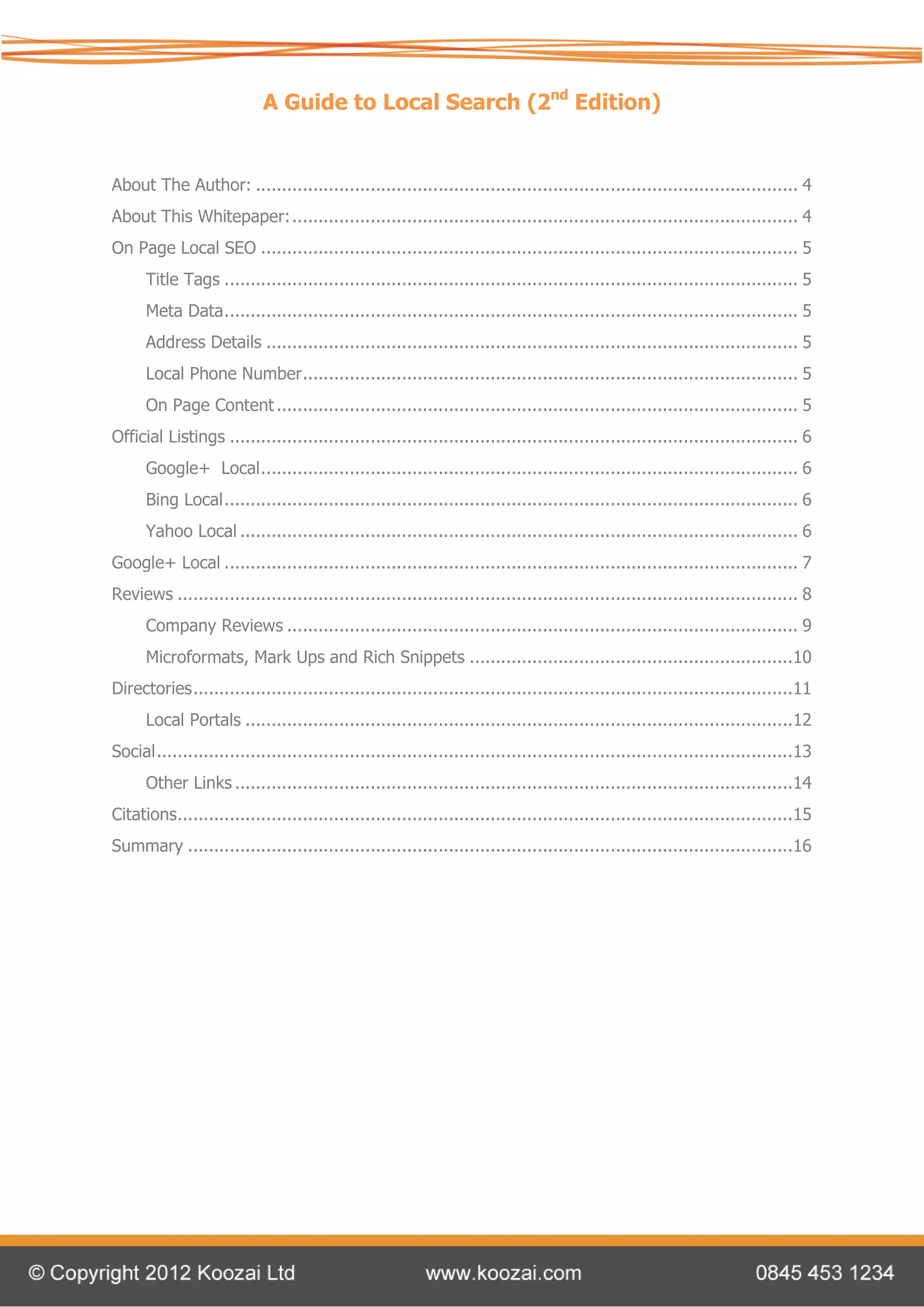 This document provides guidance on local search engine optimization (SEO). It discusses optimizing title tags, metadata, address details, phone numbers, and on-page content for local SEO. It also covers official business listings on Google, Bing, and Yahoo, obtaining reviews on Google+ and other sites, directories, social media profiles, citations, and summarizes the importance of local SEO.