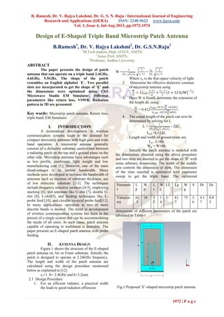 The paper details the design of an E-shaped triple band microstrip patch antenna operating at 2.4GHz, 4.6GHz, and 5.5GHz, optimized using CST Microwave Studio. The design incorporates two parallel slots to achieve the 'E' shape, enhancing performance across the specified frequency bands, with metrics like return loss and radiation patterns provided. Results indicate satisfactory parameter values, making the antenna suitable for various wireless communication applications.