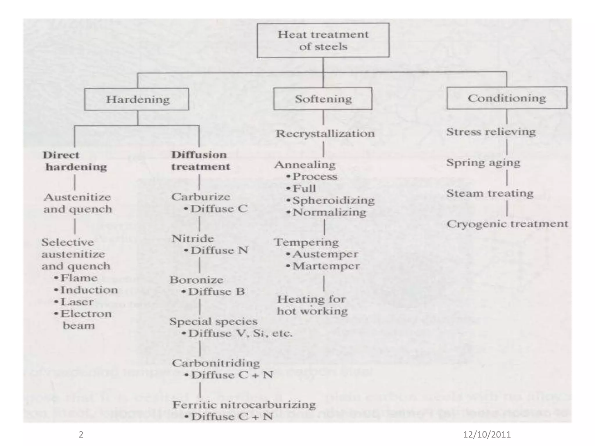2) Common heat treatments include hardening, annealing, normalizing and tempering. All involve heating, holding, and cooling, which can result in phase transformations.