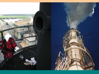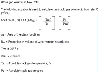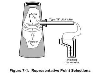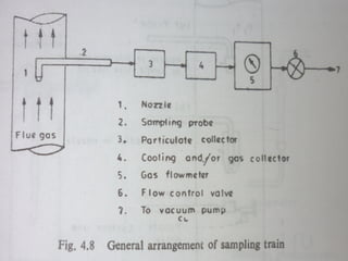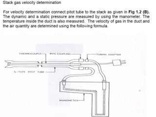 The document outlines various methods and devices used for sampling gases and vapors during air pollution monitoring. It covers principles of isokinetic sampling, types of sampling equipment like probes, suction devices, bags, and adsorption methods, as well as stack monitoring techniques to ensure compliance with environmental regulations. Additionally, it discusses the importance of collecting representative samples from different traverse points in stacks for accurate emissions analysis.