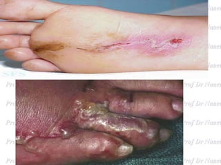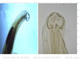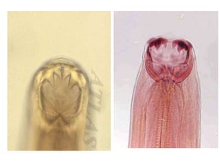 Hookworms such as Ancylostoma duodenale and Necator americanus infect humans and cause hookworm disease. They live in the small intestine where the female lays eggs that are passed in feces. When the eggs hatch in soil, they release larvae that can penetrate human skin, enter the bloodstream and mature into adult worms in the intestine. Symptoms include abdominal pain, diarrhea, and iron-deficiency anemia. Diagnosis is by finding eggs in stool samples under microscopy. Treatment involves anthelmintic drugs while prevention focuses on proper sanitation and hygiene.