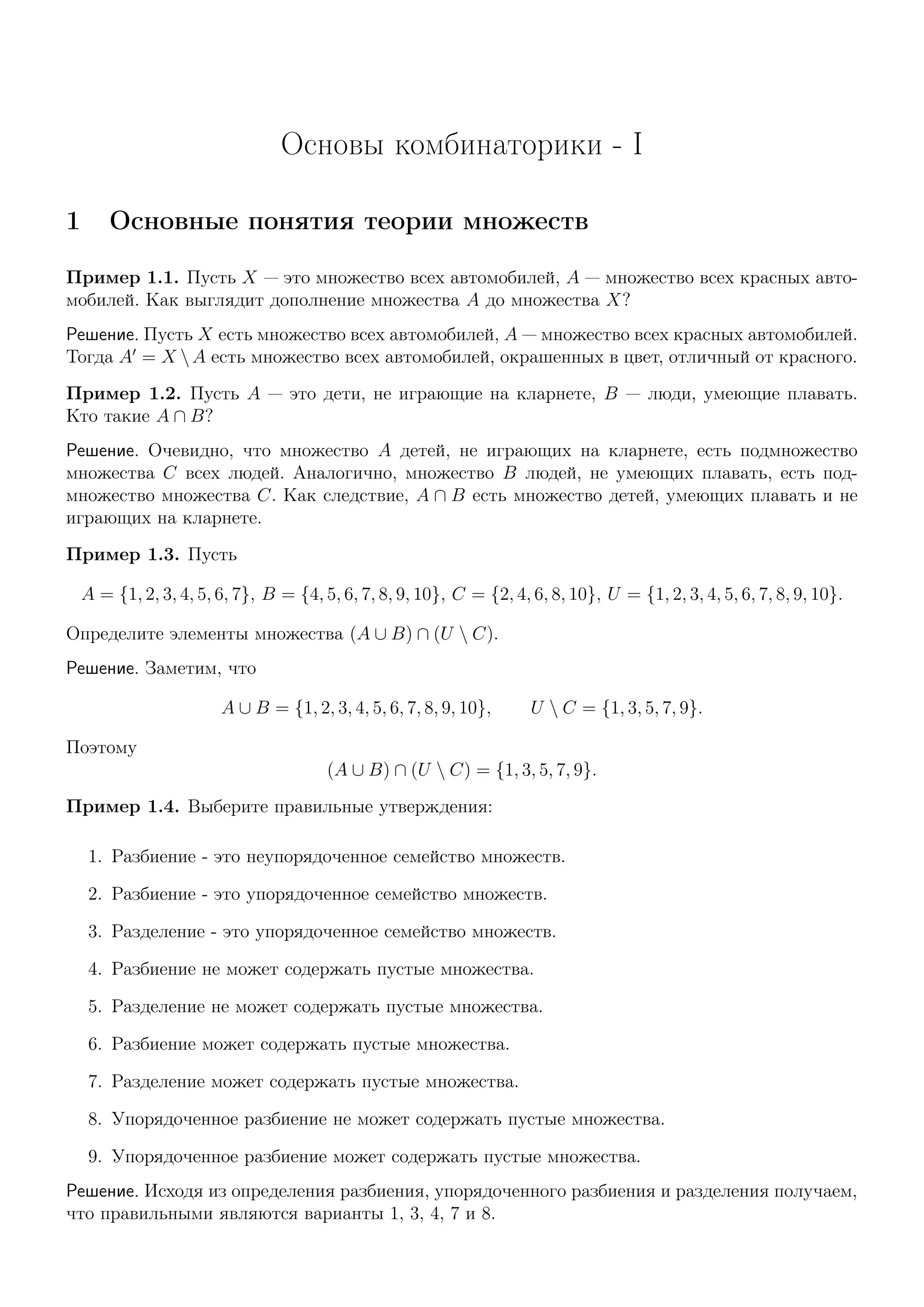 Документ объясняет основы комбинаторики, включая теорию множеств, правила перечислительной комбинаторики и принцип дирихле через примеры. Каждый пример иллюстрирует, как применять эти концепции для решения различных задач, например, определение количества элементов в множестве или выбор объектов с учетом различных условий. В конце рассматриваются ситуации, когда необходимо обеспечить наличие определенных пар объектов или элементов.