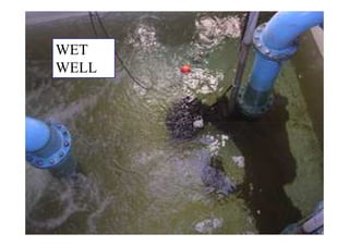 The document discusses sewage pumping stations. Sewage pumping stations are needed when sewage must be raised to flow by gravity, such as when basements are too low to discharge into main sewers or sewage must be conveyed over ridges. Problems with sewage pumping include fouling, solids causing clogs, corrosion from waste, health risks from pathogens, and flow variations. Pumping stations have dry wells to house pumps and wet wells for incoming sewage. Design considerations include retention time, water levels, screens, standby pumps, space for future pumps, and formulas for head loss and pump power.