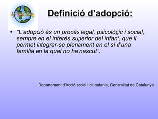 Definició d’adopció: “L’adopció és un procés legal, psicològic i social, sempre en el interès superior del infant, que li permet integrar-se plenament en el sí d’una família en la qual no ha nascut”. Departament d'Acció social i ciutadania, Generalitat de Catalunya