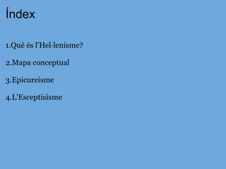 1.Què és l'Hel·lenisme?L’hel·lenisme(parlar com un grec) és aquell període que està marcat des de la mort d’Alexandre el Gran fins a la conquesta de Grècia pels Romans. Aquesta època està caracteritzada per: -Les polis eren nuclis independents, que lluitaven contra les altres per la seva expansió. -La societat no es pot basar sobre els fonaments, de la política que Aristòtil havia anomenat la més arquitectònica de les ciències. -El poder del món Grec es basava en la política. -Dins de la filosofia hel·lenística hi ha diferents “escoles”: L’epicureisme, l’estoïcisme i l’escepticisme.