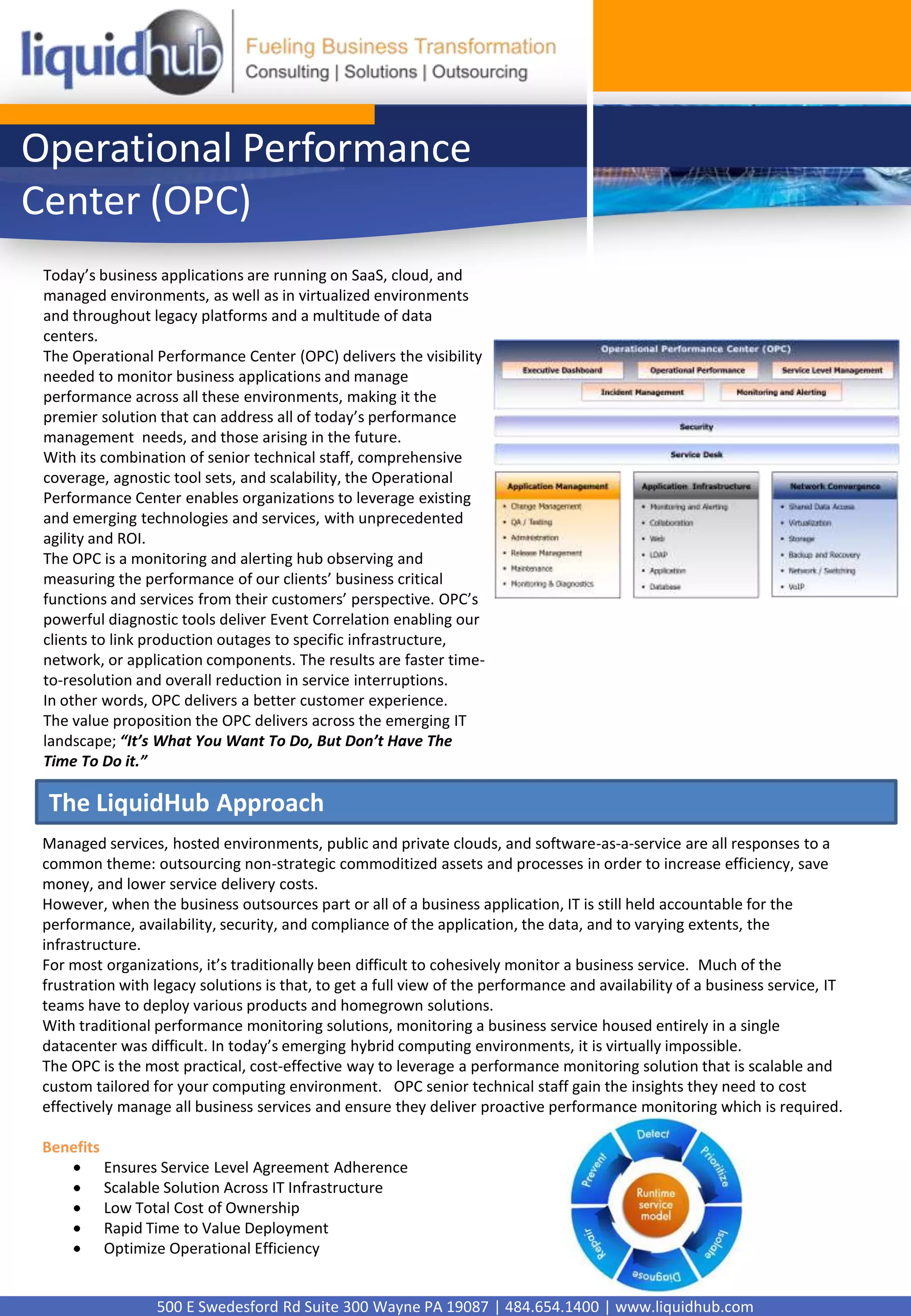 The Operational Performance Center (OPC) delivers visibility and monitoring of business applications across various environments including SaaS, cloud, virtualized, and legacy platforms. It addresses current and future performance management needs with scalable and agnostic tool sets. OPC monitors clients' critical functions and services from customers' perspectives, providing faster issue resolution and reduced interruptions through event correlation and diagnostic tools. It offers a cost-effective way to proactively monitor performance across hybrid computing environments.