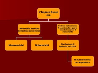 Il documento tratta della transizione dall'impero russo all'Unione Sovietica, evidenziando la rivoluzione di febbraio e ottobre 1917, l'abolizione della proprietà privata e la trasformazione della Russia in una potenza industriale sotto Stalin. Viene anche discussa la figura di Gorbaciov e le sue riforme, fino alla dissoluzione dell'URSS nel 1991, e il successivo passaggio di potere a Eltsin e Putin. Inoltre, si affronta il conflitto in Cecenia, evidenziando l'invasione russa e le motivazioni economiche e politiche alla base della guerra.