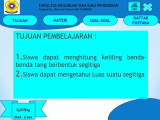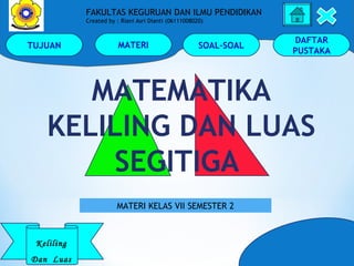 Dokumen tersebut membahas tentang keliling dan luas segitiga, dimana terdapat penjelasan mengenai rumus-rumus untuk menghitung keliling dan luas segitiga beserta contoh soalnya. Dokumen tersebut juga menyertakan tujuan pembelajaran untuk membantu siswa memahami konsep keliling dan luas segitiga.