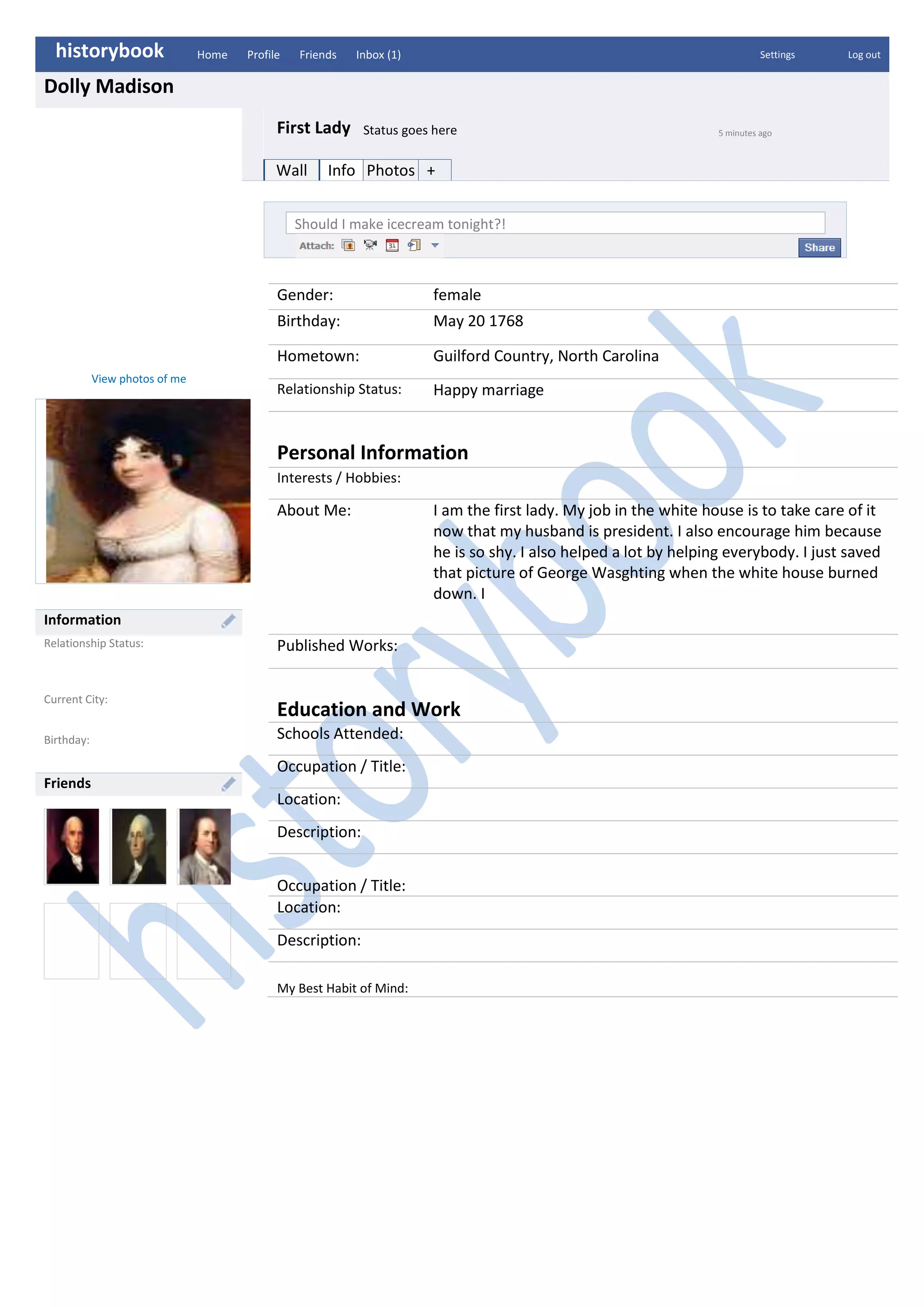 Dolly Madison was the first lady and lived in the White House with her husband who was the president. As first lady, her job was to take care of the White House and encourage her shy husband. She helped a lot by helping everybody and saved a portrait of George Washington when the White House burned down.