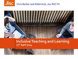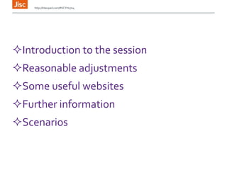This document summarizes an event on inclusive teaching and learning. It introduces reasonable adjustments that can be made for disabled students, such as training, equipment modifications, and assessment modifications. Several useful websites are listed that provide resources for dyslexia and technology. Examples include Scoop.it and websites for QR codes and digital portfolios. The document concludes with a discussion of using e-books to evidence student learning and scenarios for groups to solve technology-based issues for inclusion.