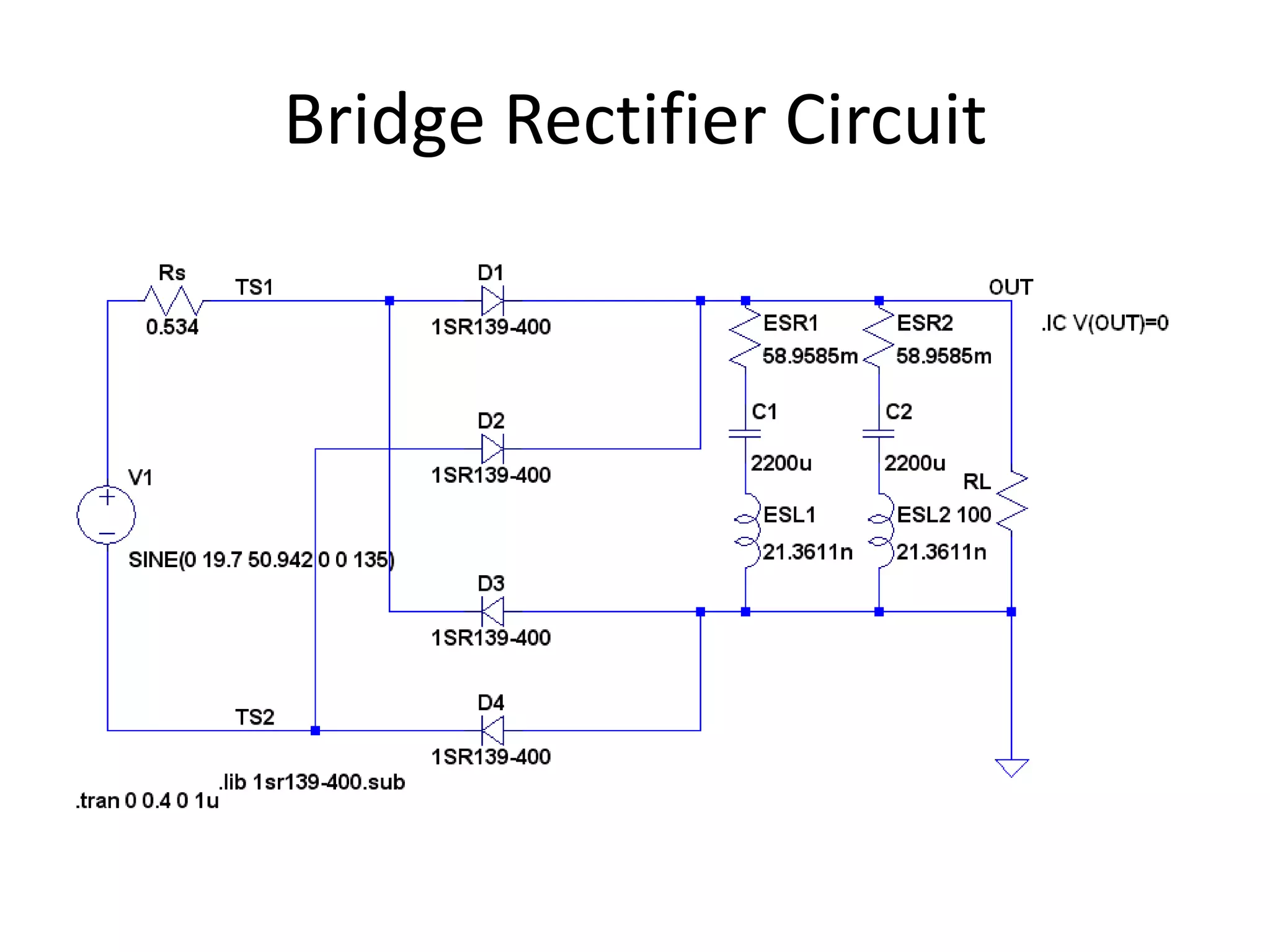 This document discusses a bridge rectifier circuit. It contains a diagram of the circuit showing the transformer input, output voltage and current, as well as the voltages and currents of diodes D1 and D2 which are part of the bridge rectifier and help to convert the alternating current to direct current.