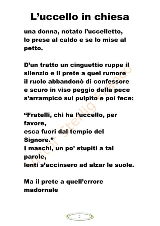 Il poema racconta la storia di un uccelletto ferito che si rifugia in una chiesa, ma la sua presenza provoca una serie di malintesi divertenti tra il parroco e i fedeli. Il prete, intento a confessare, chiede chi ha l'uccello e suscita confusione tra i presenti, in particolare tra le donne che si alzano imbarazzate. Alla fine, il prete chiarisce la sua richiesta, creando un momento comico e imbarazzante nella chiesa.