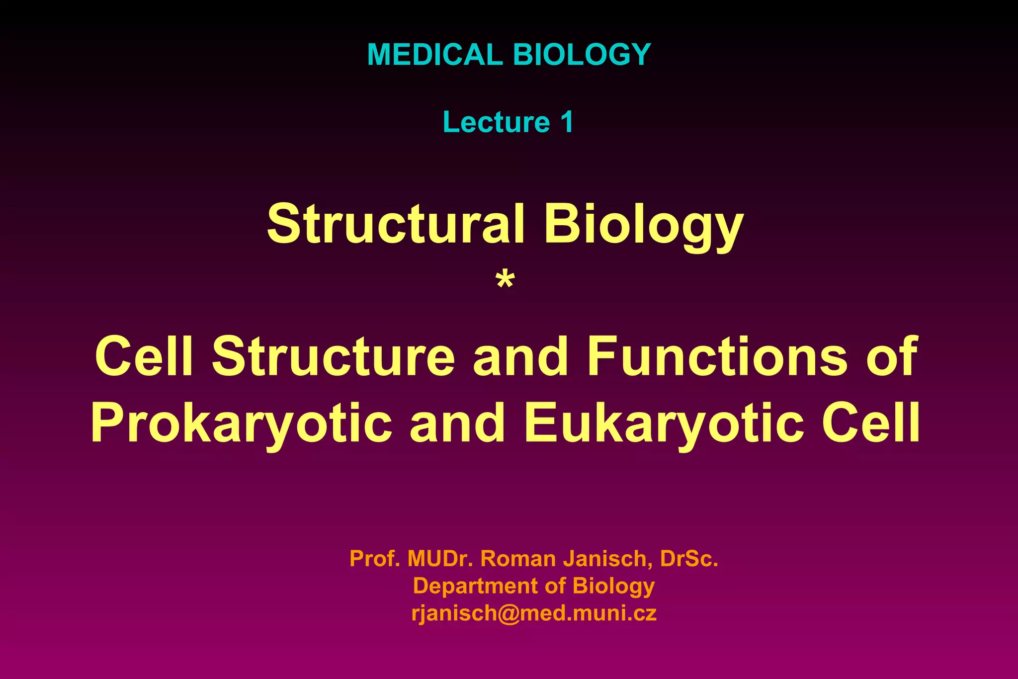 The document provides an overview of structural biology and cell structure. It discusses the hierarchy of living systems from subcellular to multicellular organisms. It describes the basic structural and functional principles of cells, including the cell memory principle based on nucleic acids and proteins, the membrane principle involving various membranes, and the cytoskeletal principle involving microtubules, microfilaments and intermediate filaments. It compares the key differences between prokaryotic and eukaryotic cells as well as animal and plant cells.