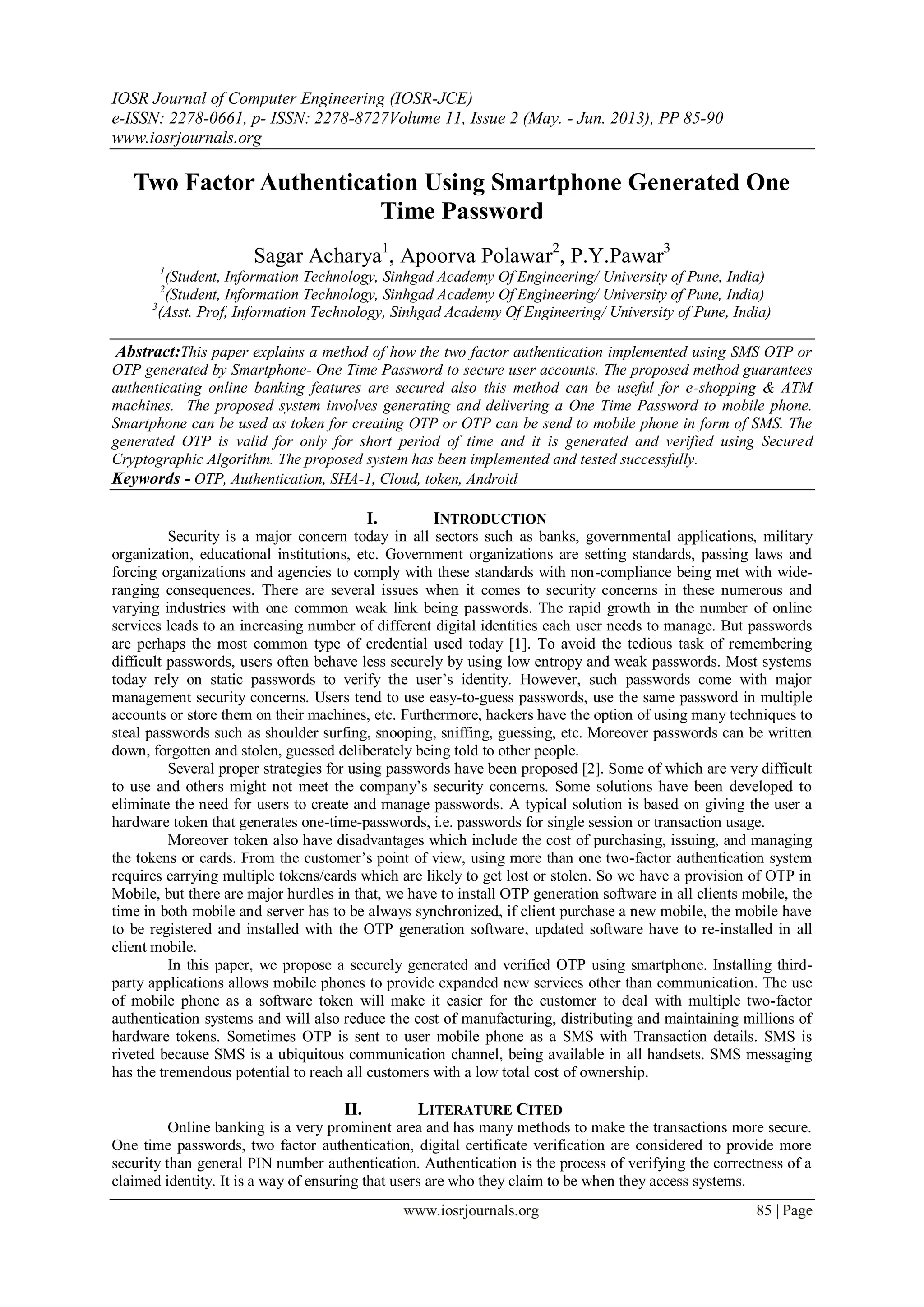 This document proposes a two-factor authentication system that uses smartphones to generate one-time passwords (OTPs). It aims to improve security over traditional password-based systems while reducing costs compared to hardware token-based OTP systems. The proposed system would have client software on PCs and Android apps to generate OTPs using cryptographic algorithms and unique device identifiers. OTPs would be validated by the server to authenticate transactions. Future work could explore using images instead of OTPs for two-factor authentication via mobile apps.