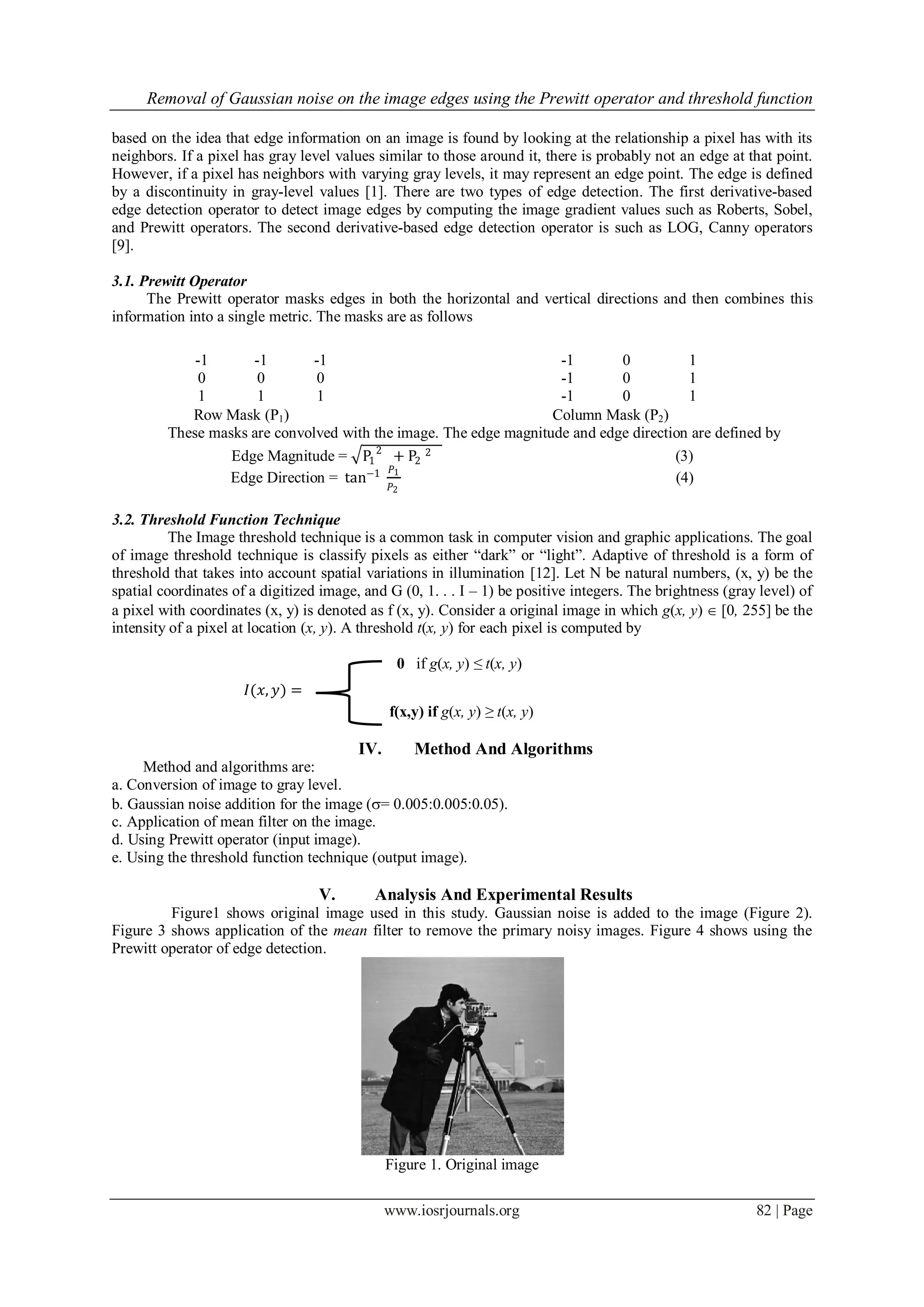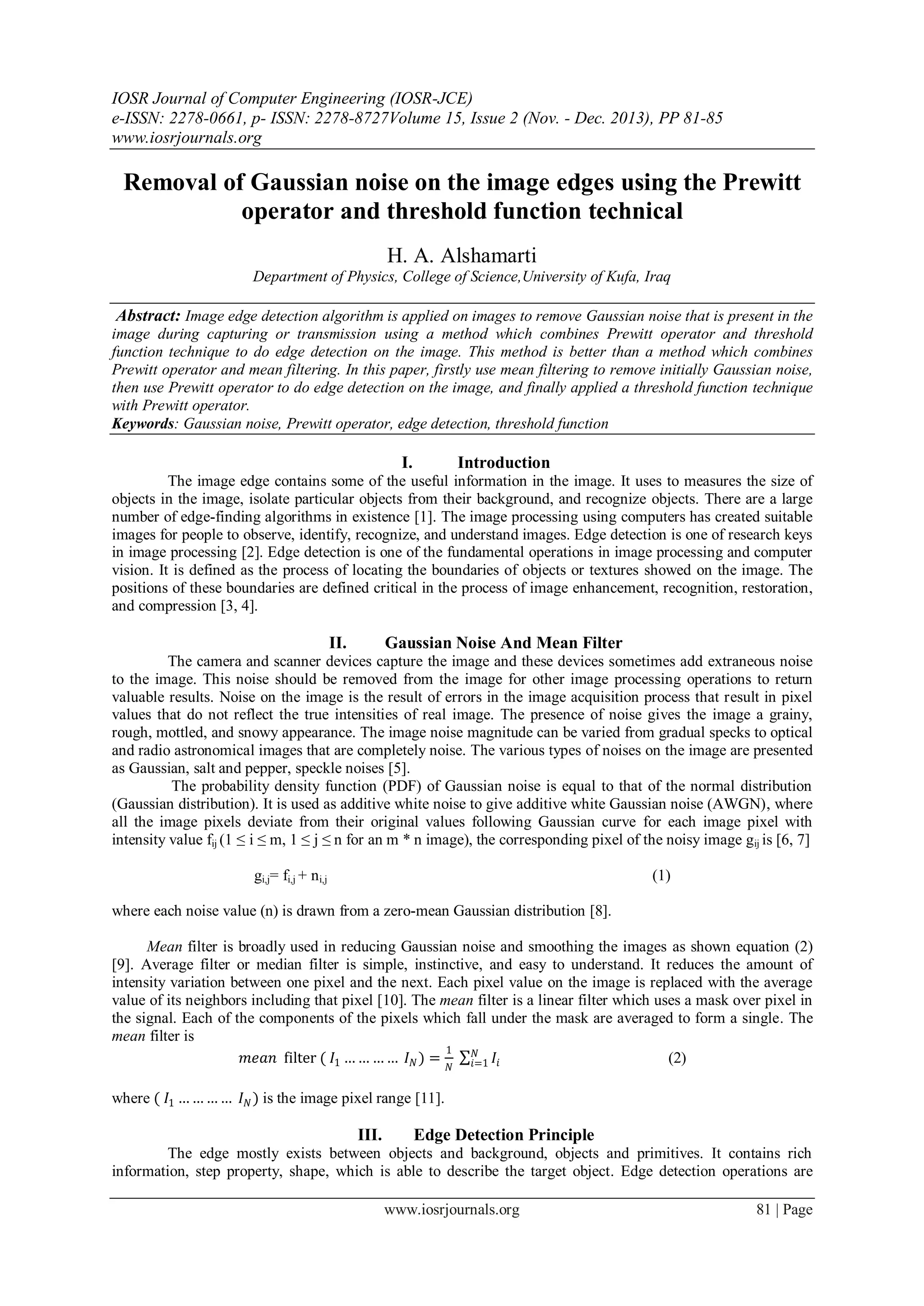 The document discusses an image edge detection algorithm that effectively removes Gaussian noise using a combination of the Prewitt operator and a threshold function technique. It evaluates the performance of these methods compared to traditional mean filtering and highlights the enhanced edge detection capabilities provided by the proposed approach. The results demonstrate that the Prewitt operator with a threshold technique significantly improves noise removal and edge detail detection in images.