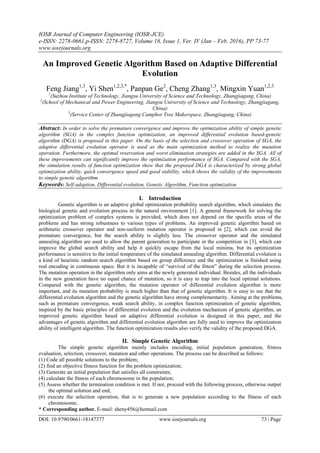 This document proposes an improved genetic algorithm called DGA that combines genetic algorithm and differential evolution. DGA uses adaptive differential evolution as its mutation operator instead of simple genetic algorithm's crossover and mutation. It also adds strategies of optimal reservation and worst elimination. Simulation results show DGA has stronger global optimization ability, faster convergence speed and better stability compared to simple genetic algorithm.