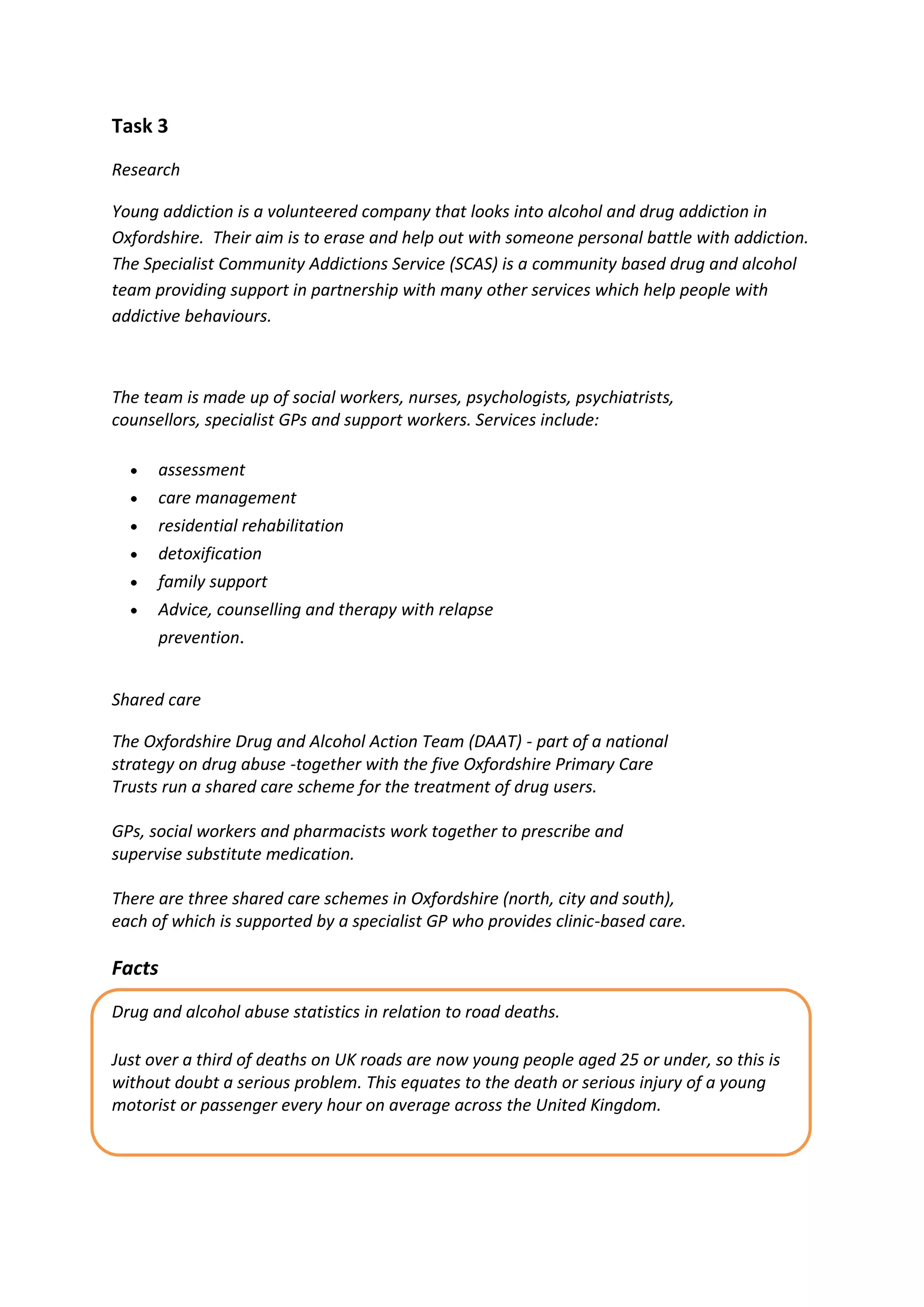 The document discusses a social project called "Young Addicts" in Oxfordshire, England. [1] It was set up by volunteers to help young people battling addiction and provides confidential support and treatment. [2] The project aims to raise awareness of addiction issues and provides a resource for those struggling as well as their loved ones. [3] It has helped many in the local community by providing a confidential space to seek advice from professionals.