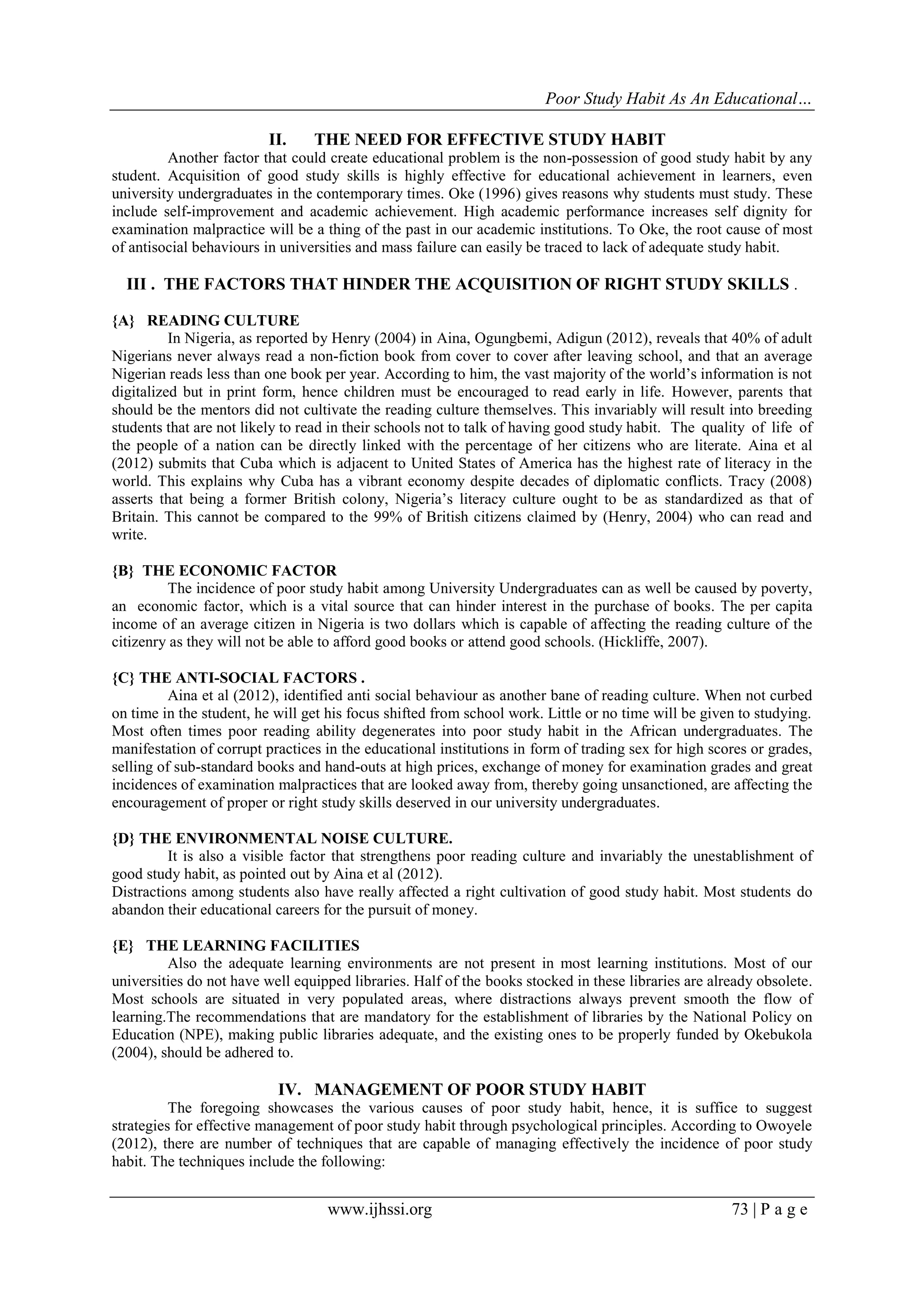 The document discusses the issue of poor study habits among university undergraduates in Nigeria, which leads to academic underachievement and failure. It identifies various contributing factors, including a lack of reading culture, socio-economic challenges, and inadequate learning environments, while suggesting strategies for improvement, such as effective study techniques and fostering a conducive learning atmosphere. The study emphasizes the importance of addressing these educational problems to enhance academic success and build integrity in institutions.
