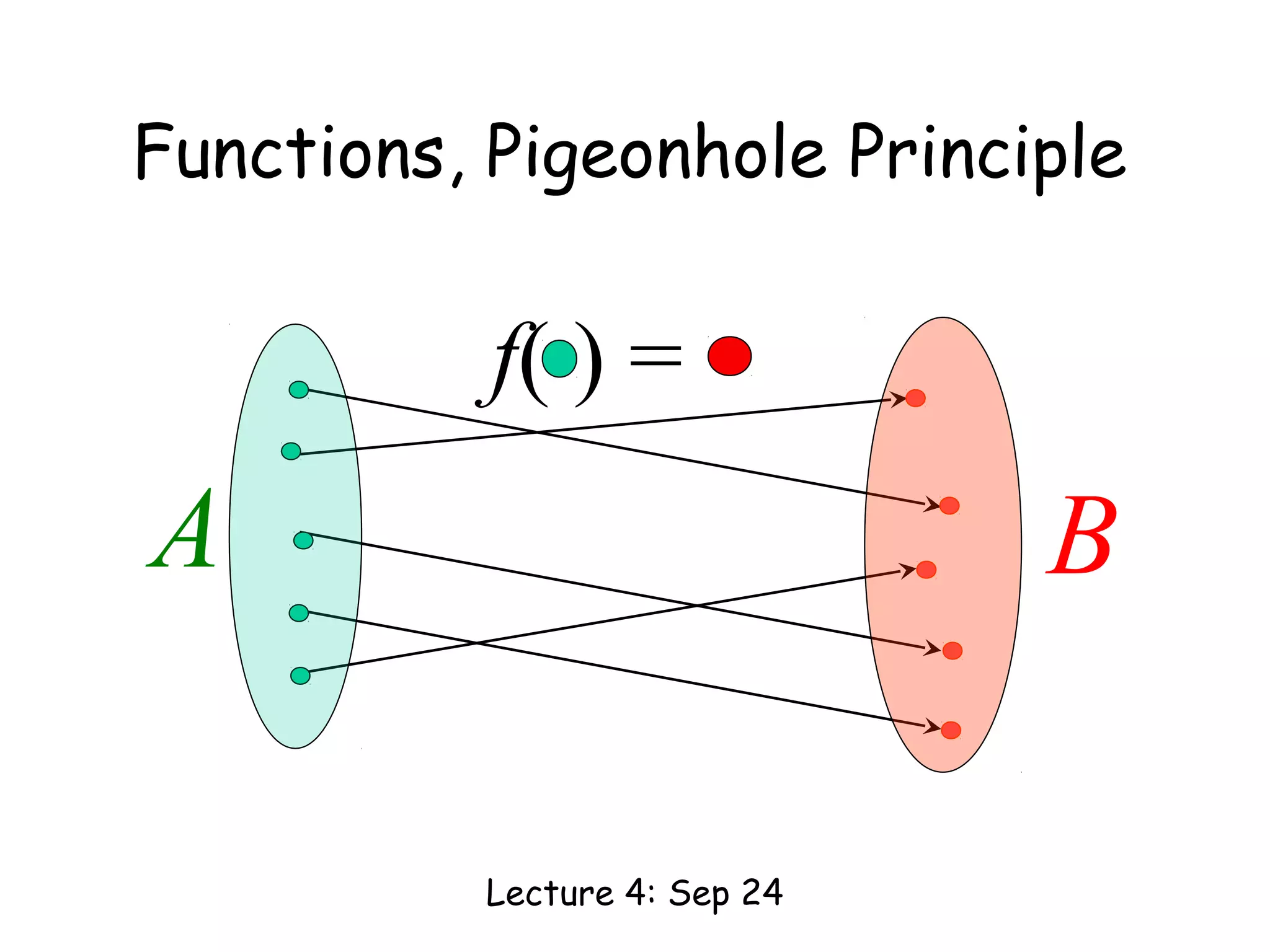 This document discusses functions, their formal definitions, and types (injections, surjections, bijections) along with the pigeonhole principle and its applications. It includes examples and exercises related to these concepts, demonstrating their implications in counting and set theory. The document also touches on the generalized pigeonhole principle and explores the implications of these principles in social scenarios and subsets.