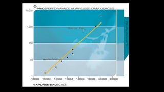 The document discusses the exponential growth of technology from the dawn of the 20th century to the present, highlighting the rapid advancement of various technologies and their lifecycle through the S-curve model. It references significant innovations and laws of technological development, such as Moore's Law, which predicts that the number of transistors on integrated circuits will double approximately every 18-24 months. The text also addresses the impact of technology on society, emphasizing both the disruptive and opportunistic aspects of technological evolution.