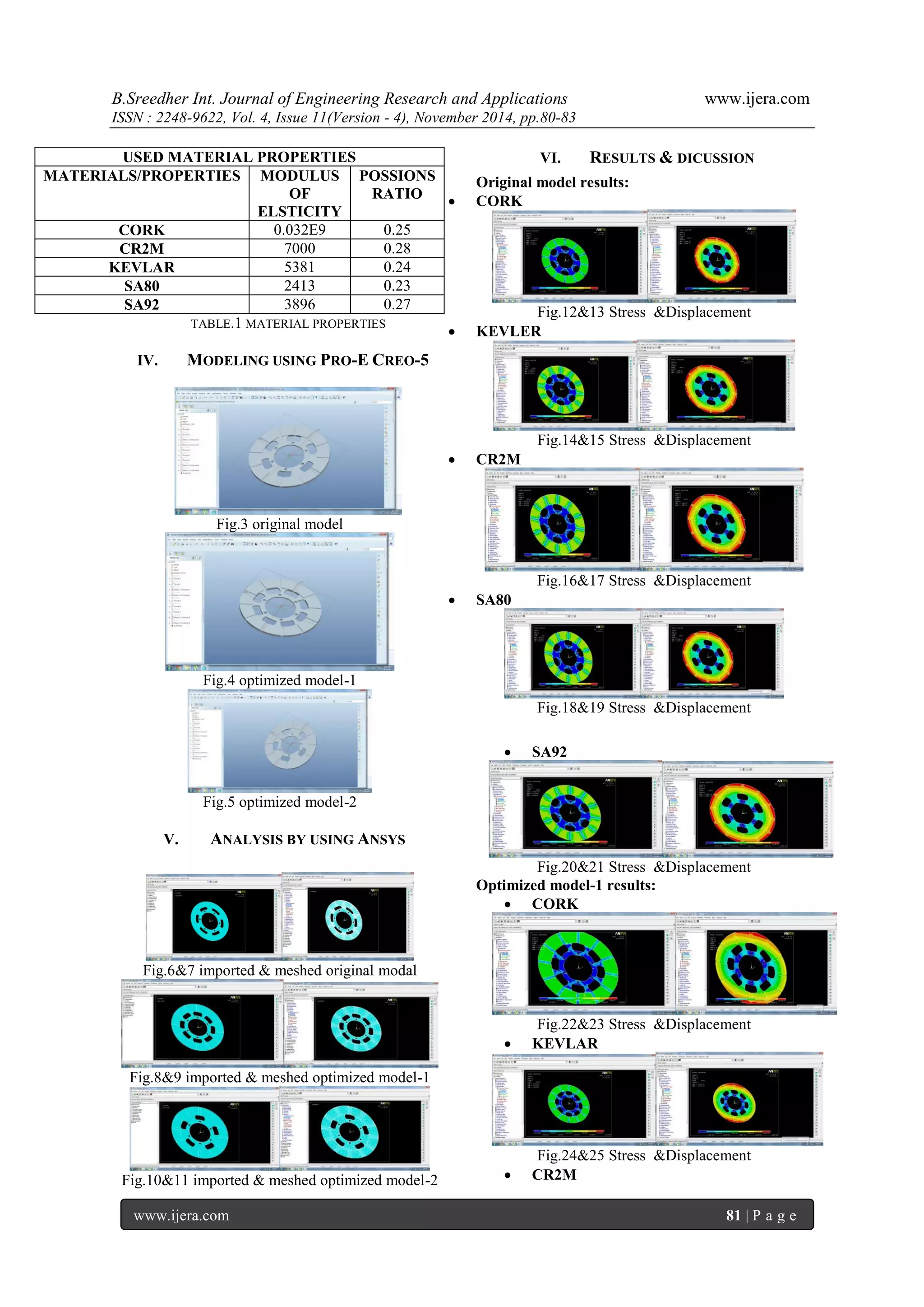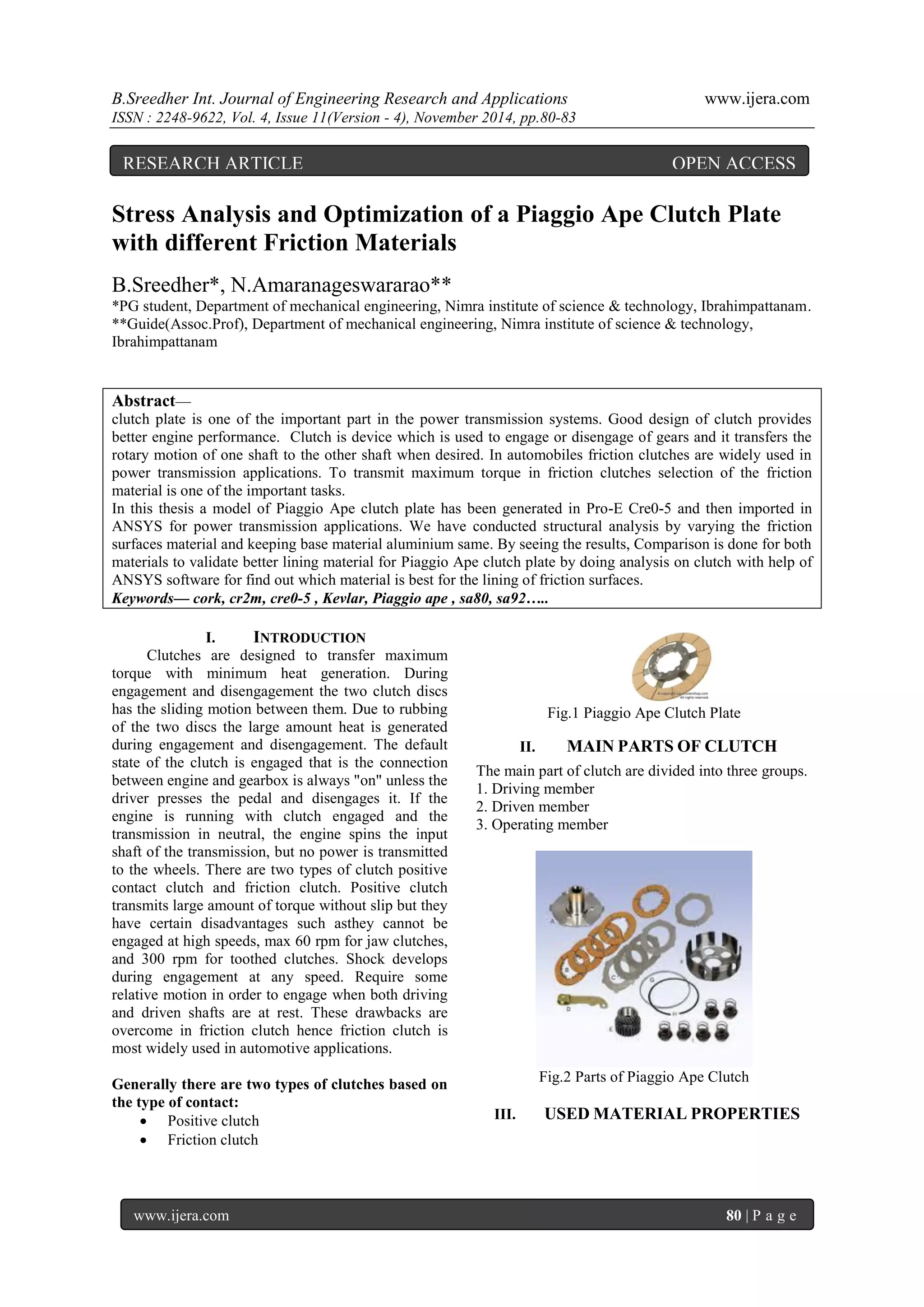 The document presents a study on the stress analysis and optimization of a Piaggio Ape clutch plate using different friction materials, focusing on improving engine performance through effective clutch design. A model was created in Pro-E Creo-5 and analyzed in ANSYS, comparing materials such as cork, Kevlar, and hybrid SA80 to determine the best friction lining. Results indicate that the SA80 material offers lower stress and deformation values, making it more advantageous for use in Piaggio Ape clutch plates compared to others.