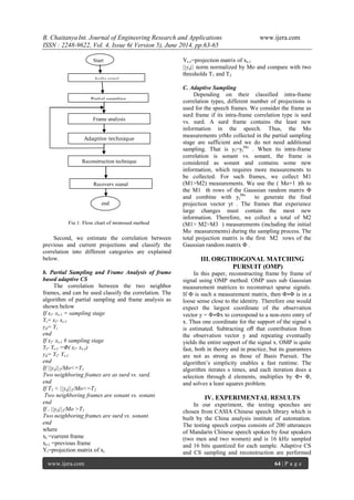 This document proposes a frame-based adaptive compressed sensing technique for speech signals. It divides speech sequences into non-overlapping frames and processes each frame independently. It then classifies frames based on the correlation between the current and previous frames. Depending on the classification, different sampling strategies are applied - fewer measurements for highly correlated frames and more measurements for frames with more new information. Experimental results show the proposed adaptive technique provides better speech reconstruction quality compared to non-adaptive compressed sensing.