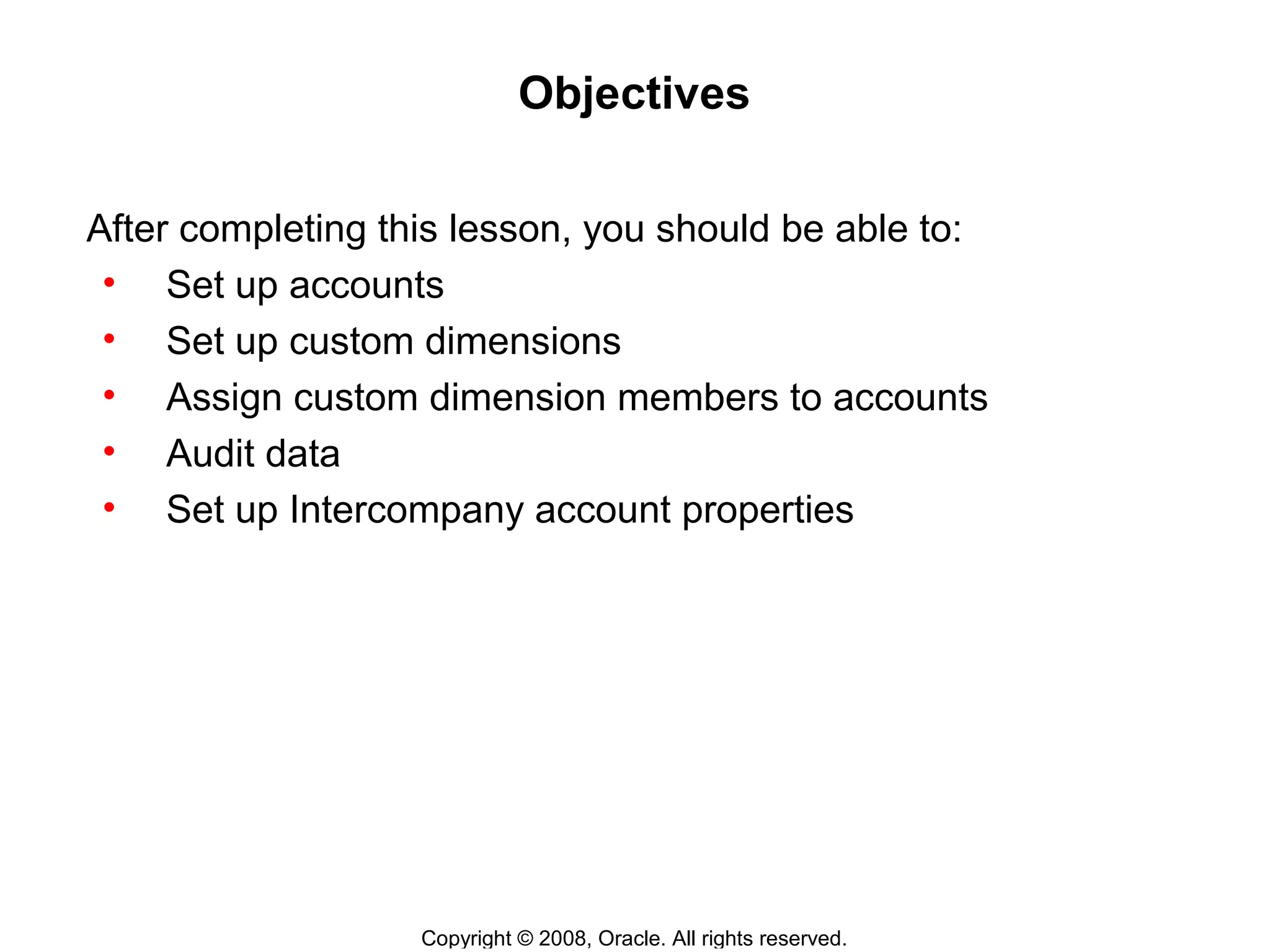 This document discusses how to configure accounts and custom dimensions in Oracle's planning and budgeting cloud. It covers setting up account types and hierarchies, assigning custom dimension members to accounts, auditing data, and setting properties for intercompany accounts. Custom dimensions can provide additional details for accounts, and different account types determine how child values are aggregated or subtracted from parents.