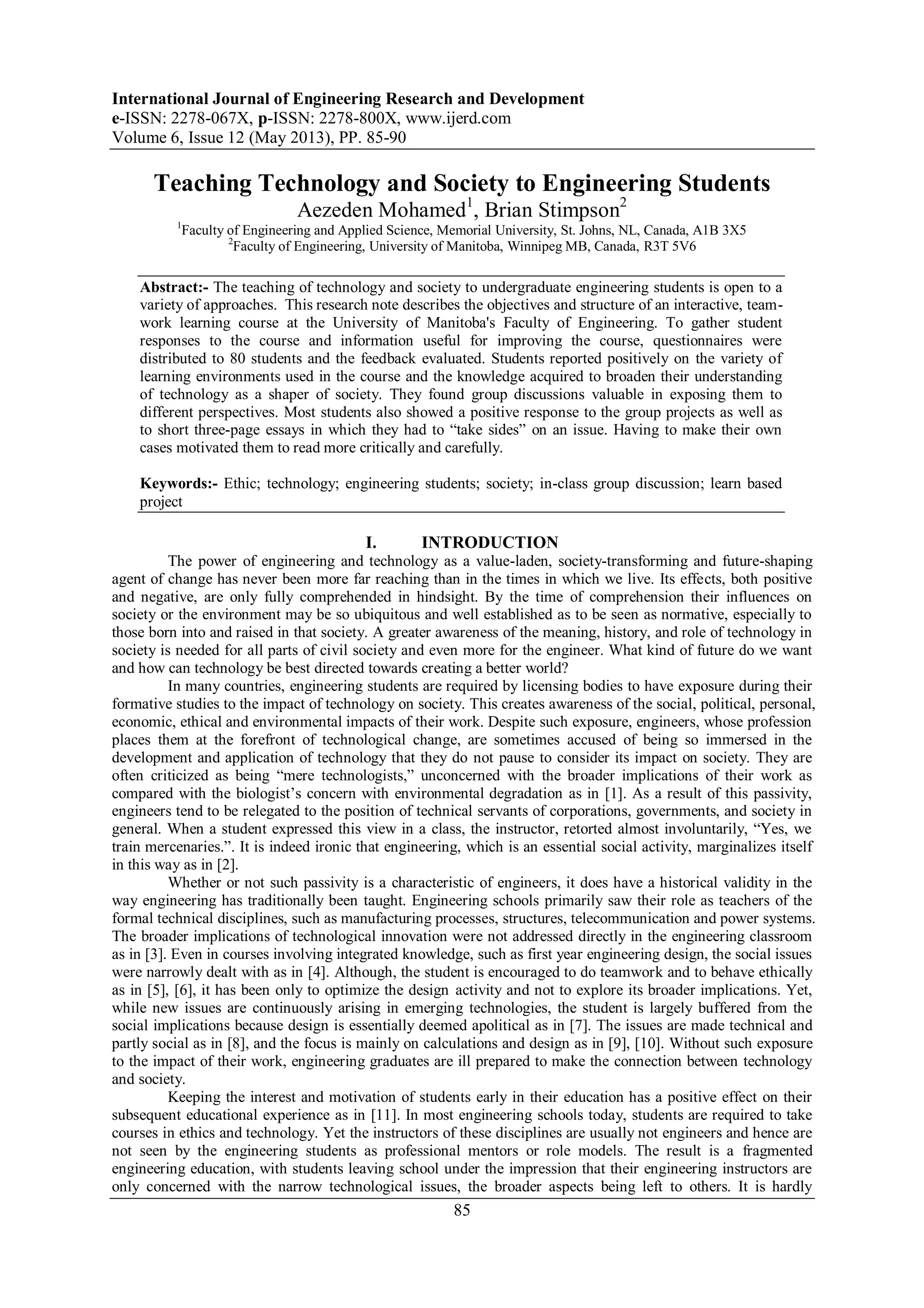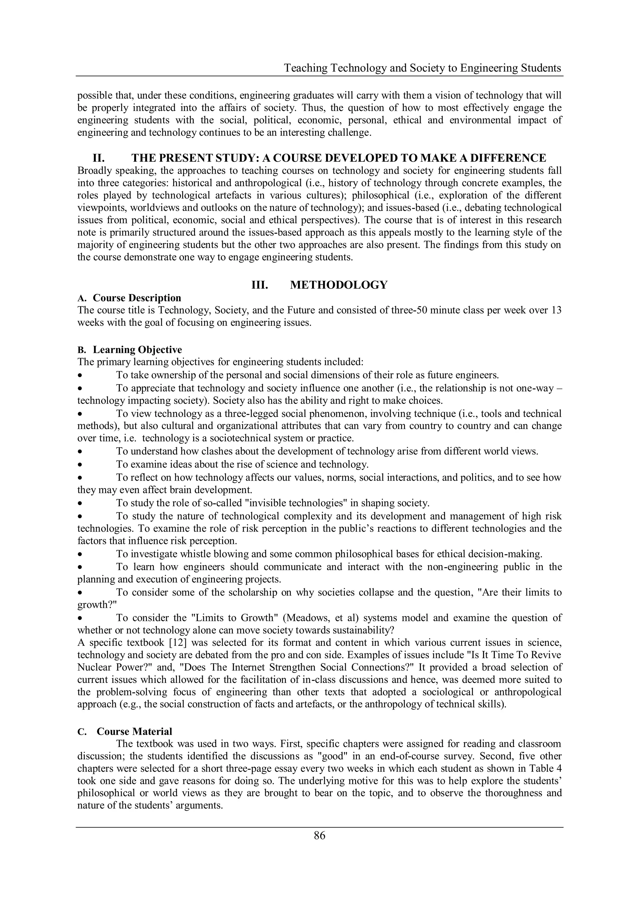 This document outlines a course developed to teach engineering students about the interplay between technology and society, emphasizing various pedagogical approaches such as interactive teamwork and critical discussions. Student feedback from course evaluations indicates a positive reception, particularly regarding group discussions and projects that challenged them to consider different perspectives. The course aims to enhance students' awareness of their ethical responsibilities as future engineers, promoting engagement with social, political, and environmental impacts of technology.