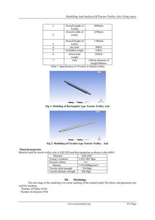 This document presents a study on the modeling and static analysis of tractor trolley axles using ANSYS and CATIA V5 to optimize design by replacing rectangular cross-sections with circular ones. The analysis indicates a significant weight reduction of 40% while ensuring that the stress induced on the axle remains within safe limits under specified loading conditions. The findings suggest improved efficiency and cost-effectiveness for small-scale industries manufacturing tractor trolleys.