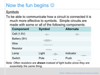 This document discusses symbols and components used in simple circuits. It introduces common circuit symbols such as cells, batteries, wires, resistors, lamps, switches, voltmeters, and ammeters. It explains that resistors and lamps are essentially the same component. The document also discusses how to connect a voltmeter and ammeter to measure voltage across and current through a resistor in a simple circuit.