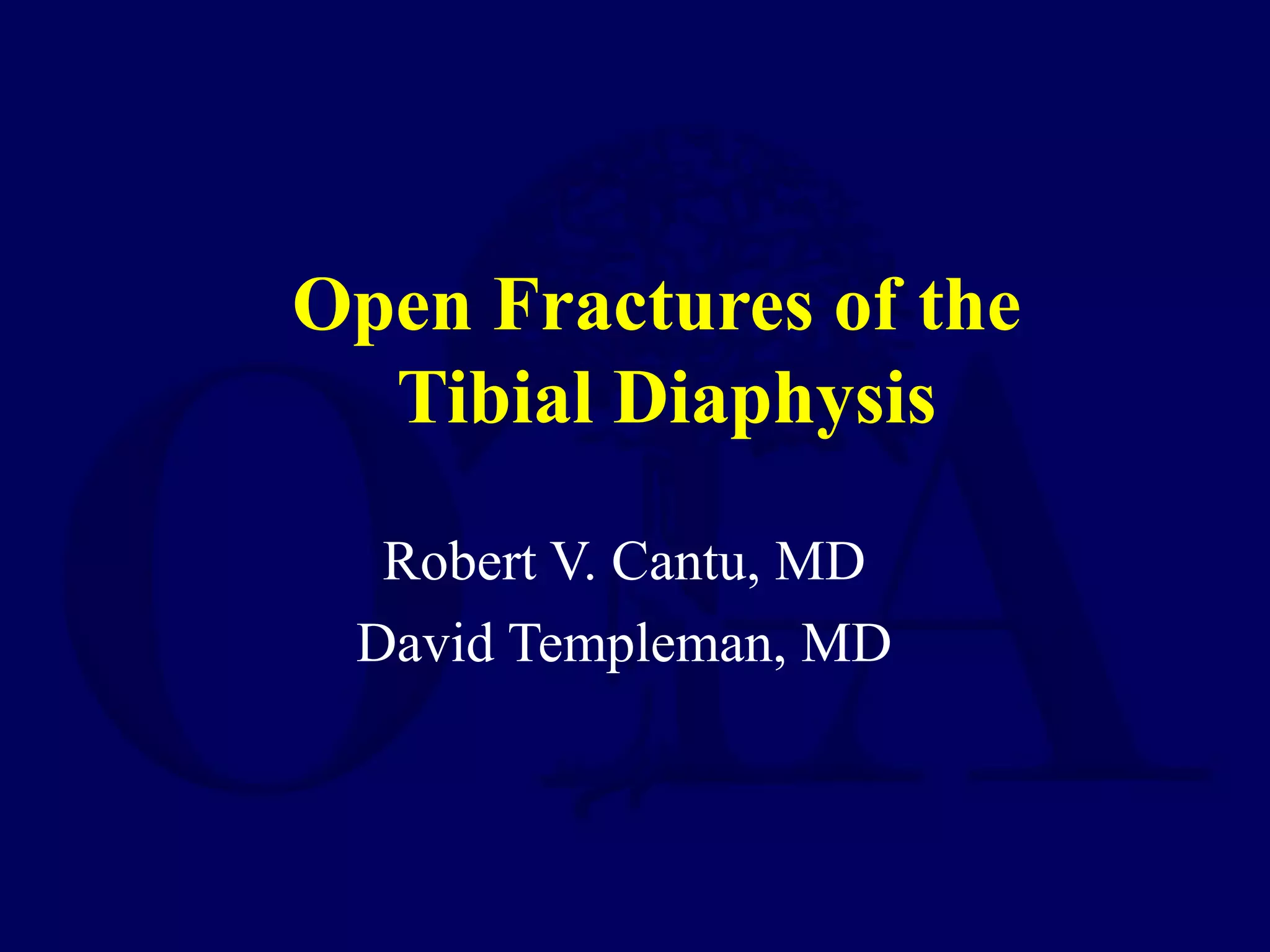 This document discusses open fractures of the tibial diaphysis (shaft). It notes that open tibia fractures account for about 1/4 of all tibial fractures and occur more commonly in the tibia than any other long bone. Treatment involves thorough debridement and irrigation of the soft tissue wound, antibiotics, and stabilization of the bone fracture, which may be via internal or external fixation depending on the fracture pattern and soft tissue injury severity. Complications include infection, nonunion, malunion, and compartment syndrome. Outcomes depend highly on the severity of soft tissue and neurovascular damage based on the Gustilo-Anderson classification.