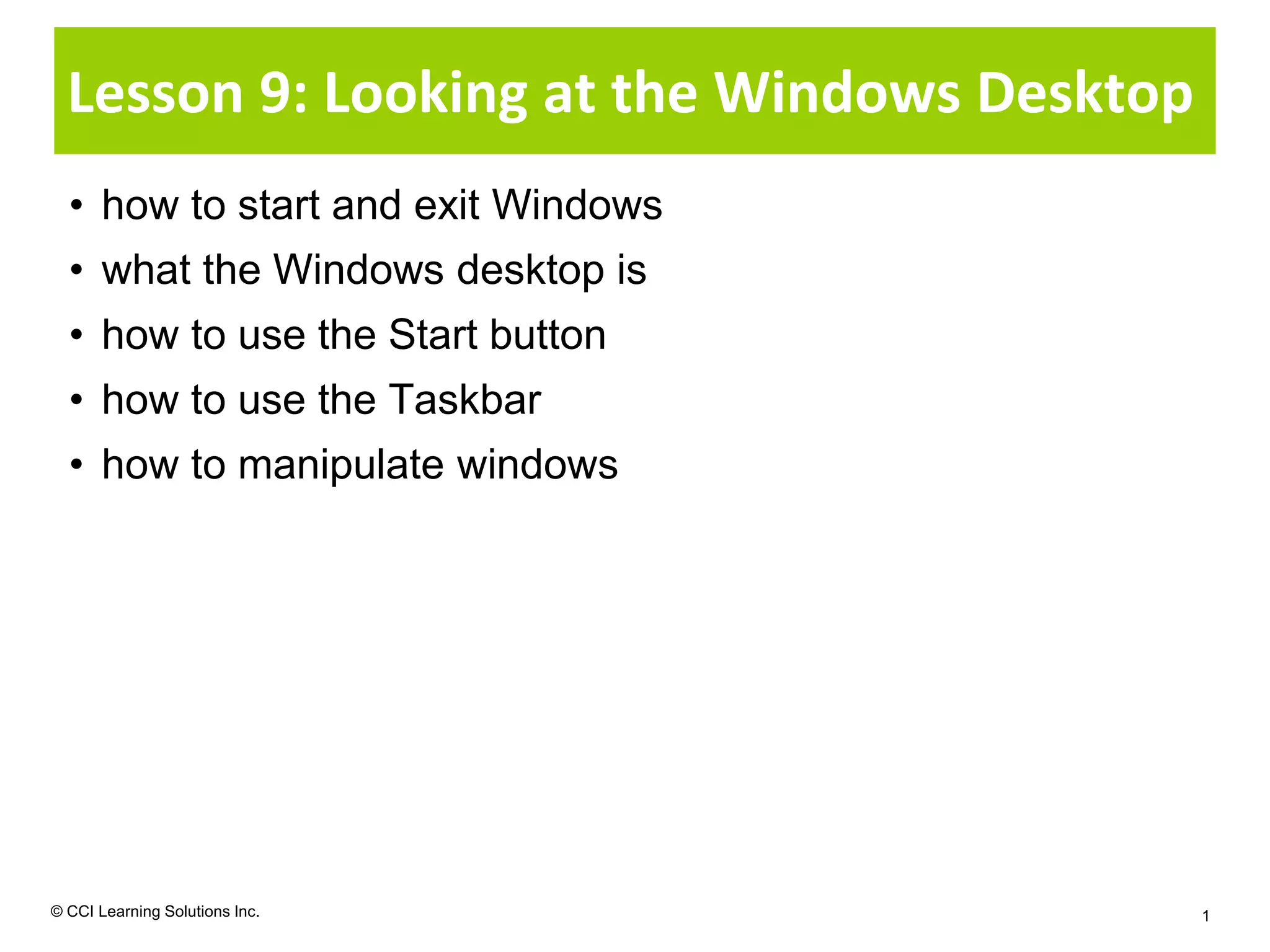 The document discusses key aspects of the Windows desktop interface, including how to start and exit Windows, what the desktop and Start button are used for, and how to manipulate windows. It describes the desktop icons, taskbar, Start menu, window elements like the title bar and scroll bars, and how to properly exit Windows by logging off, restarting, or shutting down.