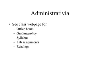 This document provides an introduction to the Csci 107 Introduction to Computer Science course. It discusses administrative details about the class website and outlines what computer science entails. Computer science is defined as the study of algorithms, their properties, efficiency, applications to problems, and their implementation through programming languages and computer hardware. An algorithm is a well-defined procedure to solve a problem that must be ordered, understandable, solve the problem, and terminate. Examples of algorithms include cooking recipes, making a sandwich, and adding multi-digit numbers. The next class will cover Chapter 1 of the textbook and thinking through the algorithm to add two multi-digit numbers.