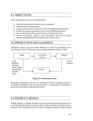 This document discusses production planning and control. It begins by defining production management and describing the key steps in production planning and control, including product design, production system design, manufacturing process selection, routing, scheduling, loading, dispatching, and follow up. It emphasizes the importance of production planning and control for small entrepreneurs in optimizing capacity utilization, inventory control, reducing production time, and ensuring quality. Overall, the document provides an overview of production planning and control and its benefits for efficient production management.