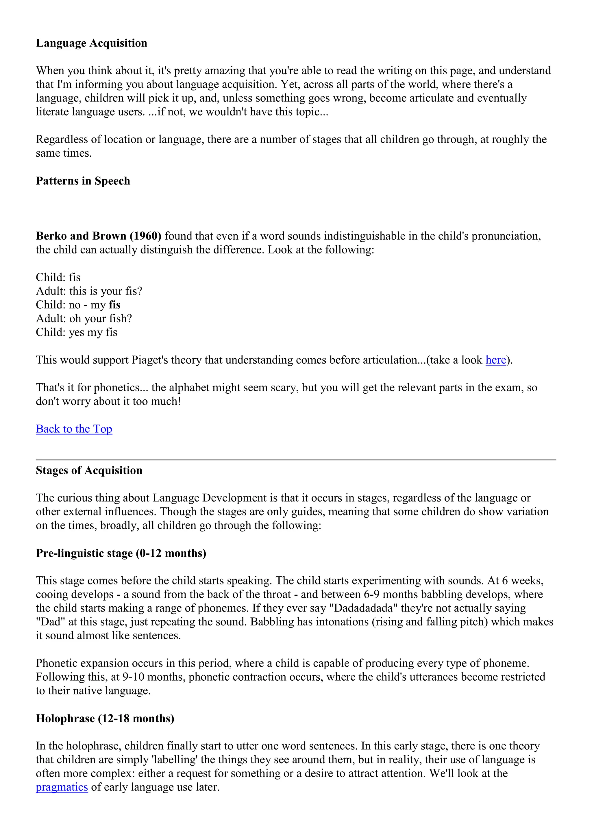 Children acquire language in predictable stages regardless of location or language. There are pre-linguistic, one-word, two-word, and telegraphic stages where children's utterances become more complex as their vocabulary and grammar develop. Theories suggest children's early language serves practical, social, and learning purposes rather than just labeling objects. Children master grammar structures like pluralization before structures like past tense as they progress toward fluent language use by age 5.