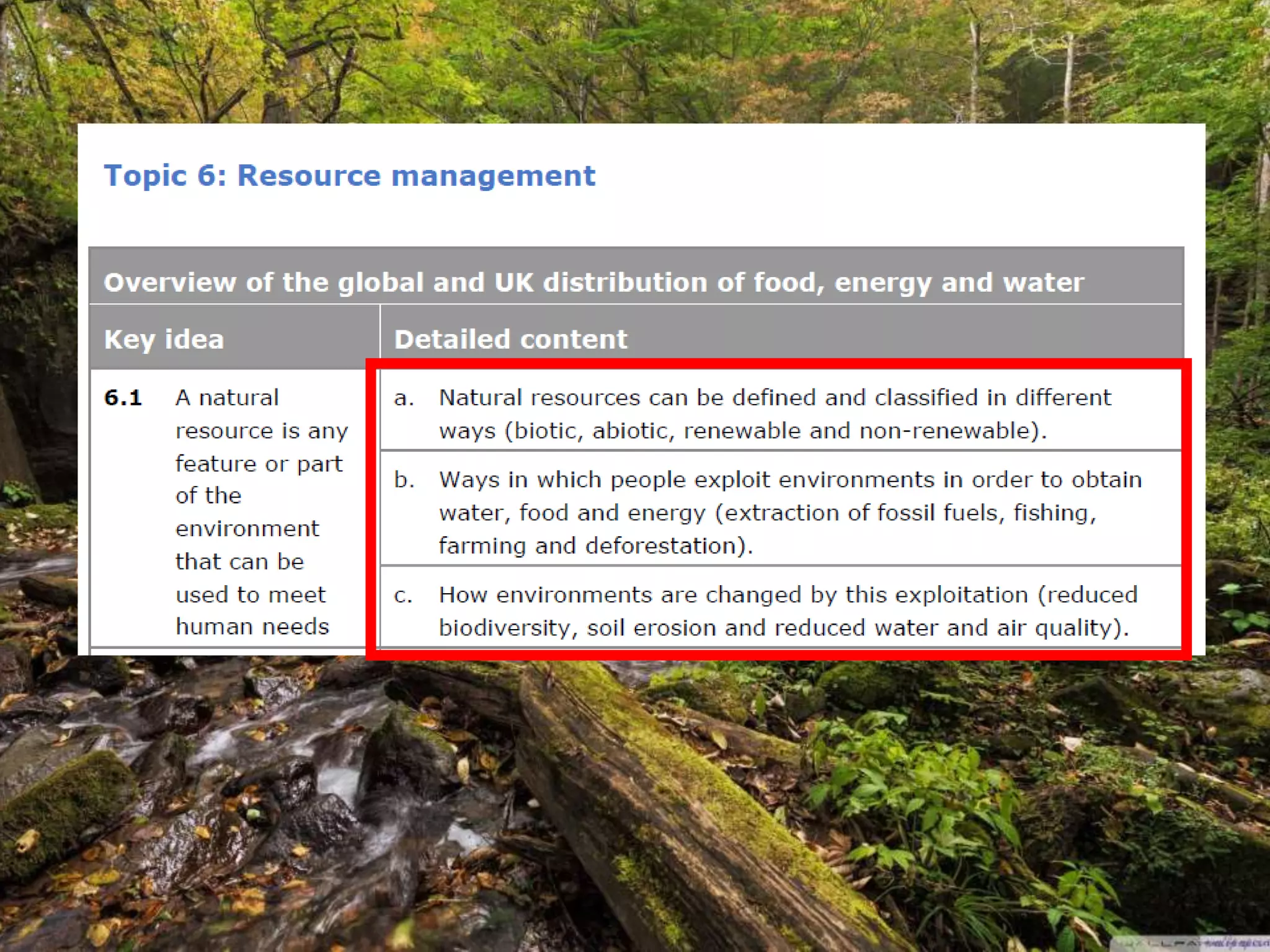 The document defines and classifies natural resources. It distinguishes between biotic factors like living organisms and abiotic factors like non-living things. Resources are also classified as renewable like solar energy or non-renewable like fossil fuels. Humans exploit resources through activities like overgrazing, overfishing, deforestation, and overusing water. This causes changes like soil erosion, declining fish populations, loss of biodiversity, and depleted aquifers. Humans also exploit energy resources but burning fossil fuels pollutes the environment and contributes to issues like acid rain.