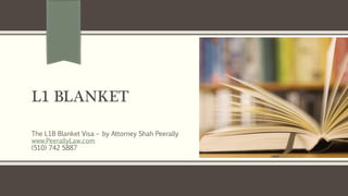 The document discusses the L1 Blanket visa, which allows companies to transfer multiple employees to the US under one petition, once qualified. To qualify, a company must: have an office in the US for 1+ years, have 3+ domestic/foreign branches, and meet additional criteria like 10 L1 approvals in the past year. Once approved, individual employees still require approval by showing 1 year work experience and qualifications for an executive/manager or specialty occupation. The blanket approval simplifies the process but employees must apply through consulates or USCIS like regular L1 visas. Options are discussed for Canadians applying at ports of entry.