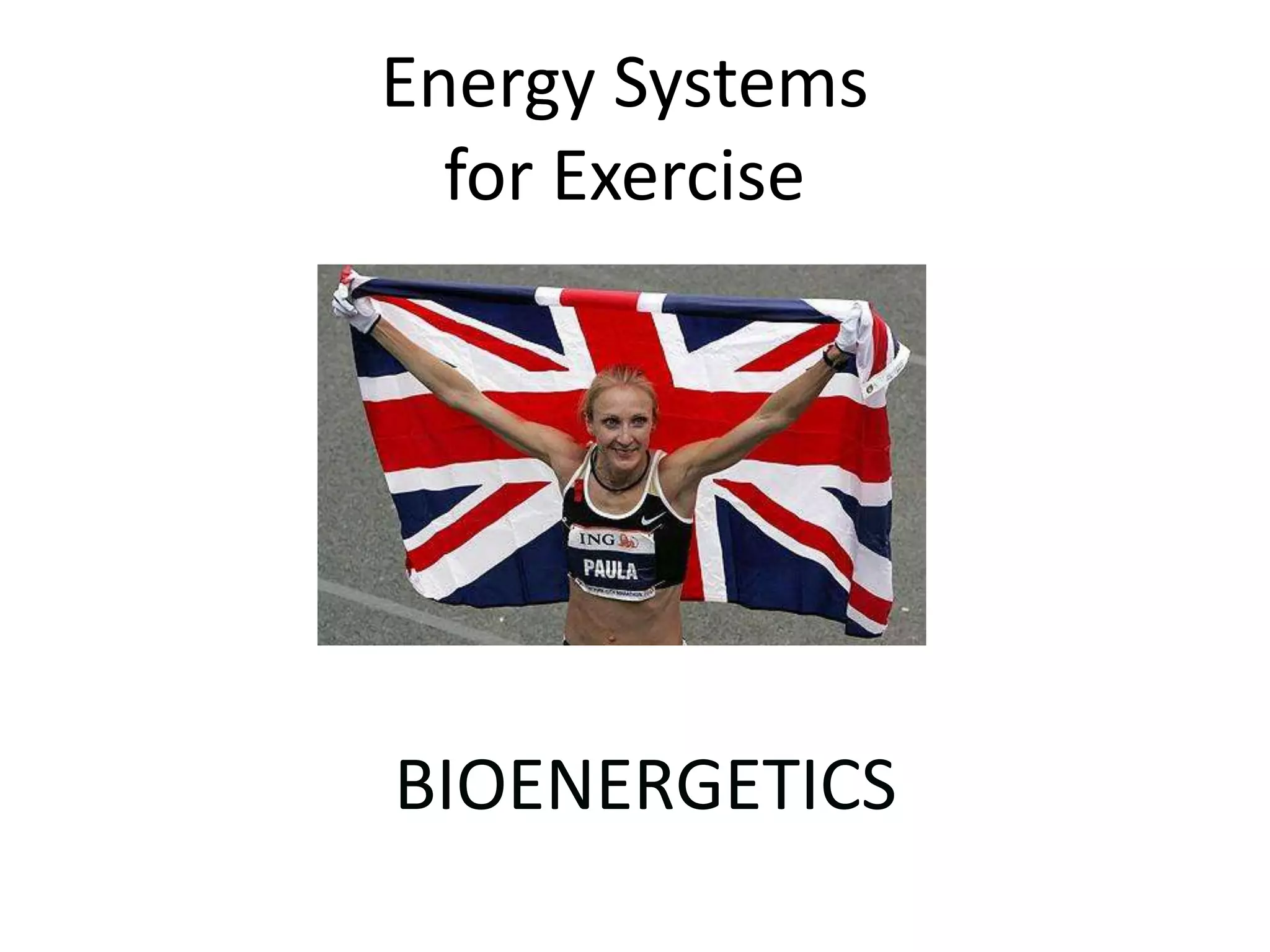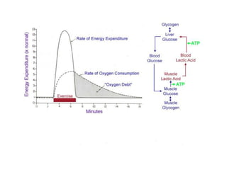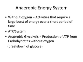 2. There are three main energy systems: the ATP-CP system which provides energy for up to 10 seconds; anaerobic glycolysis which takes over for 1-3 minutes; and the aerobic system which sustains energy for over 3 minutes through oxidative phosphorylation.