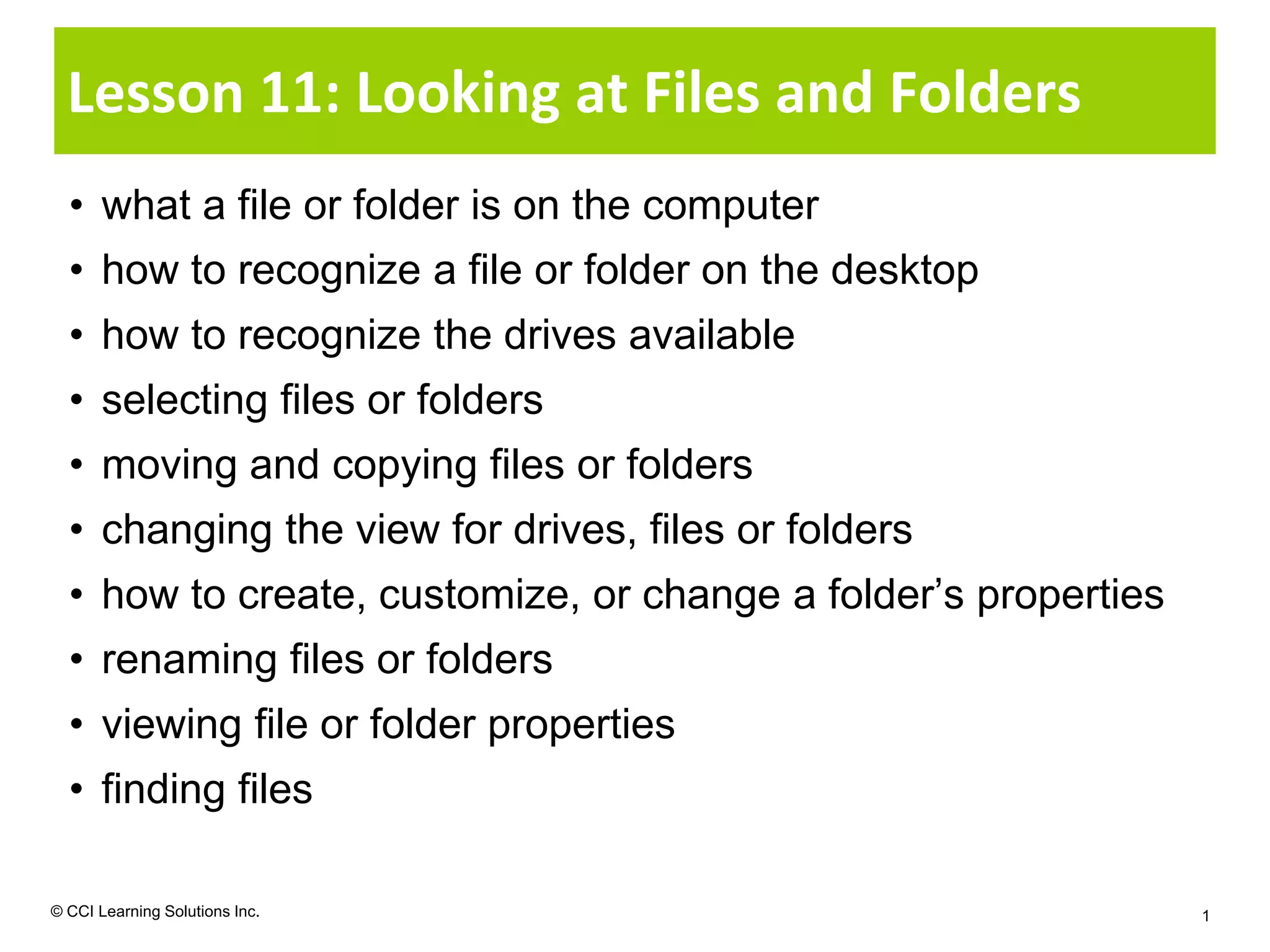 The document discusses what files and folders are, how they appear visually in Windows Explorer, and basic functions for working with files and folders such as selecting, copying, moving, renaming, and viewing properties. It also briefly outlines different views available in Windows Explorer and how to search for files.