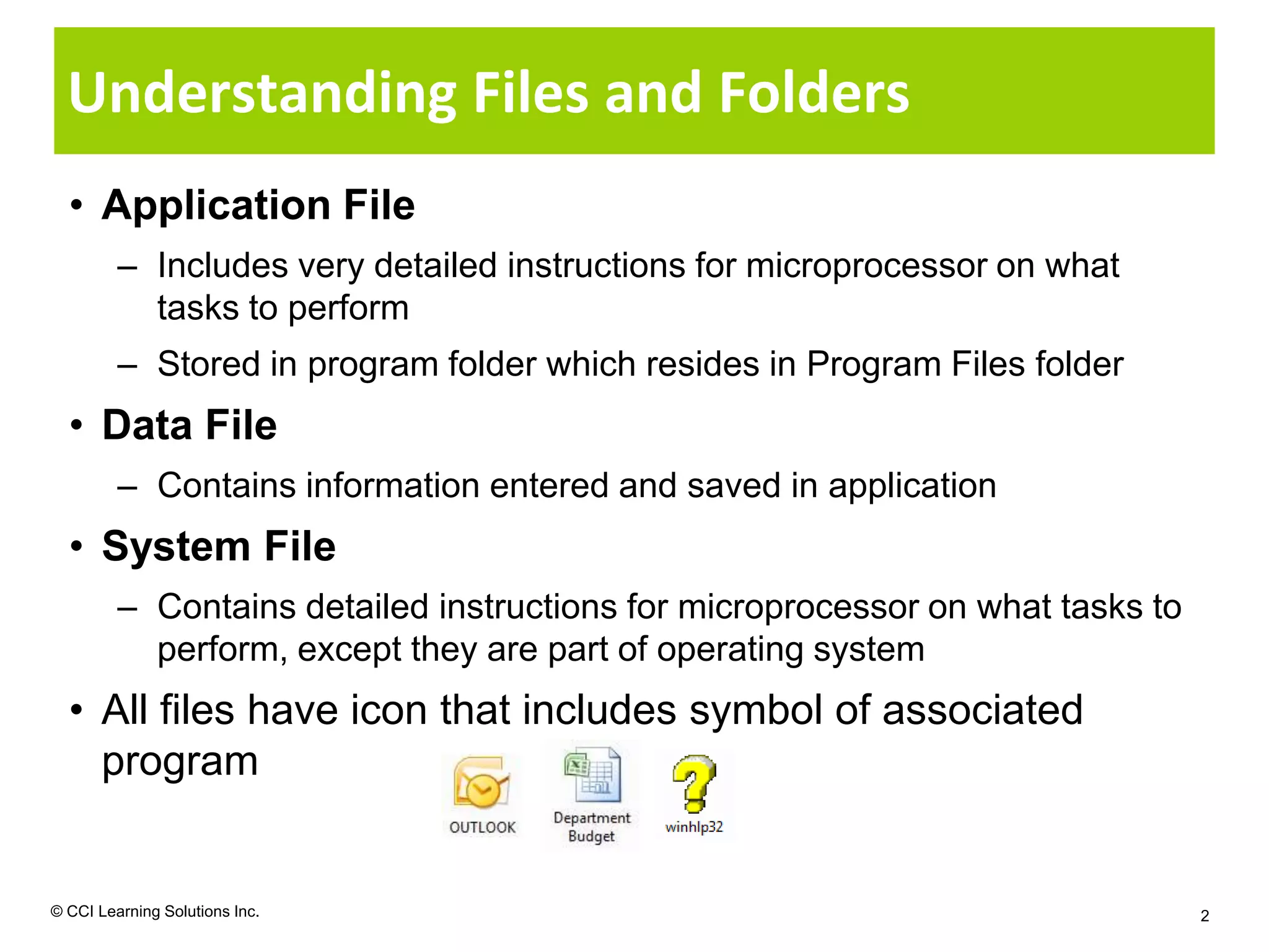 The document provides an overview of files and folders in 3 paragraphs or less: