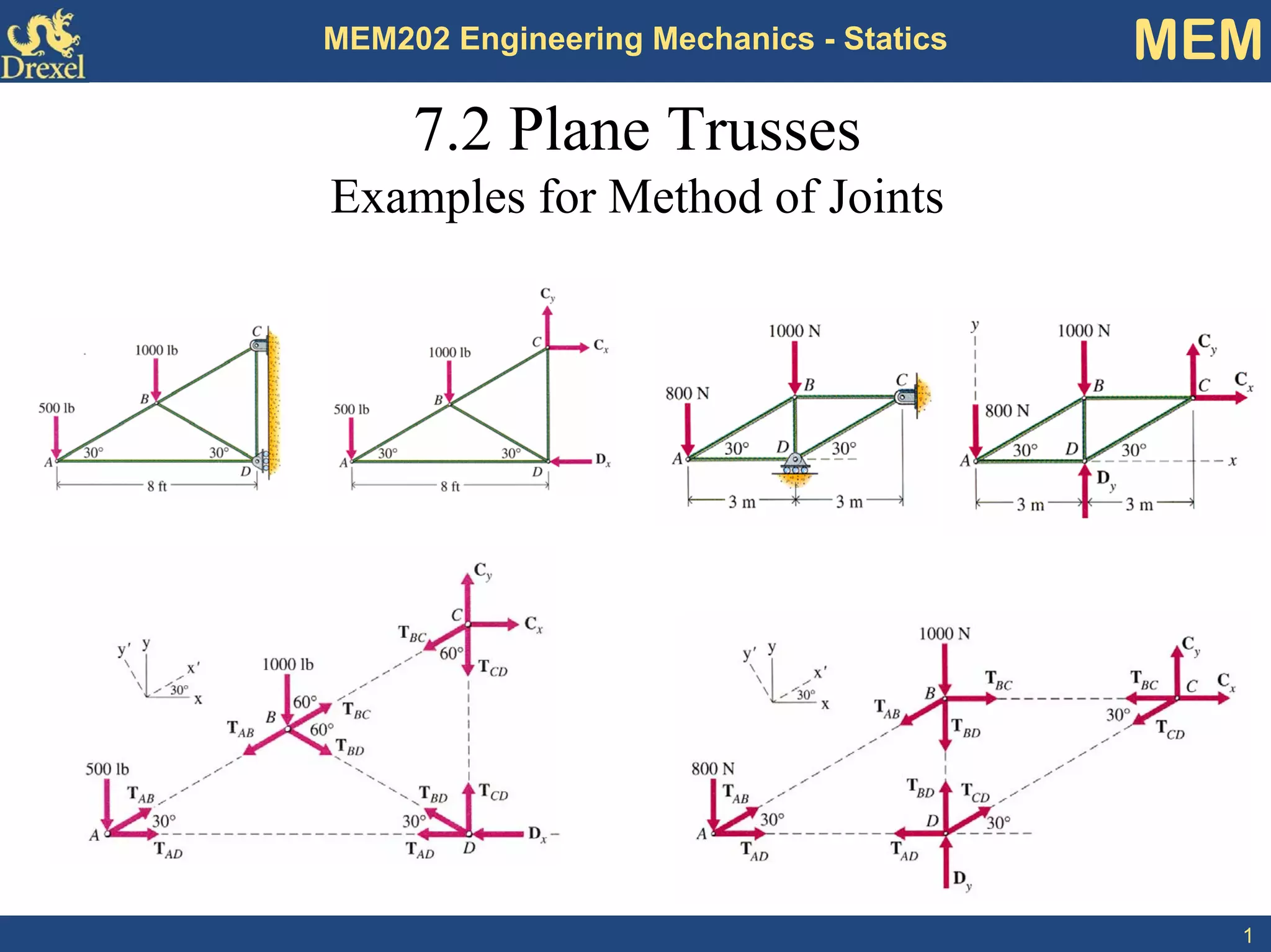 This document discusses methods for analyzing plane trusses, including the method of joints and method of sections. The method of joints is more convenient for simple trusses where all member forces are needed, while the method of sections is better for complex trusses where only a few member forces are required. The method of sections involves dividing the truss into parts with an imaginary cut and using equilibrium equations to solve for unknown member forces. An example of applying the method of sections to a space truss is also provided.
