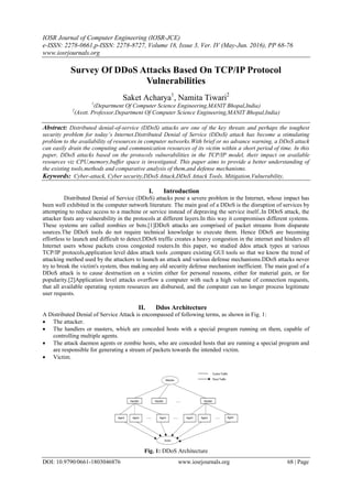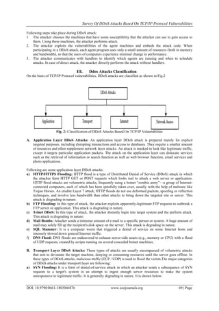 This document summarizes a survey of distributed denial-of-service (DDoS) attacks based on vulnerabilities in the TCP/IP protocol stack. It begins by introducing DDoS attacks and their architecture, then classifies DDoS attacks according to the TCP/IP layer they target - application layer, transport layer, or internet layer. Specific attack types are described for each layer, including HTTP flooding, SYN flooding, Smurf attacks, and more. The document aims to provide understanding of existing DDoS attack tools, methods, and defense mechanisms.