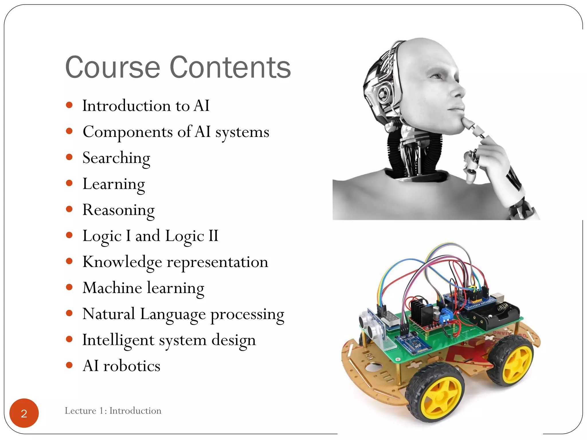 - An overview of course contents which cover key AI topics like search, learning, reasoning, and machine learning.
